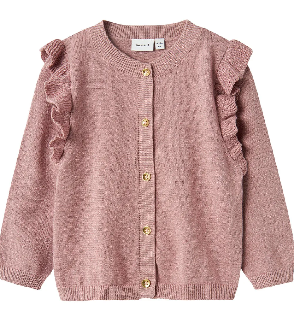 Lækker Name It cardigan i gammelrosa strik, med en flot glimmereffekt.