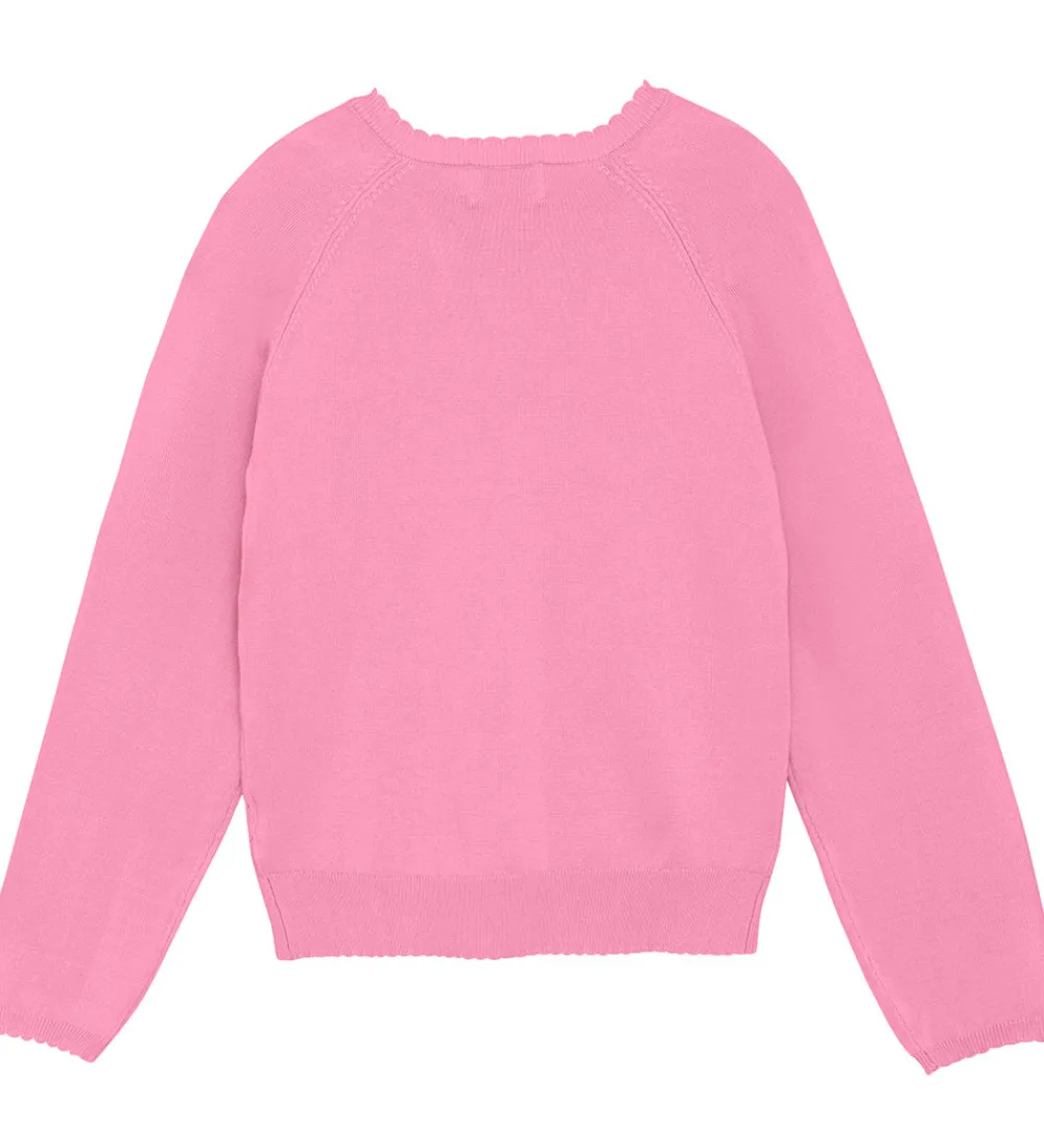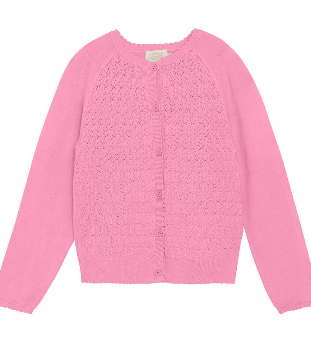 Smuk Creamie cardigan i pink strik med detaljeret hulmønster foran og med bølgede kanter i cardiganens åbninger. Den har lange ærmer og knaplukning fortil, hvilket gør den til et stilfuldt valg til enhver garderobe. Cardiganen er fremstillet i en en meget blød kvalitet.