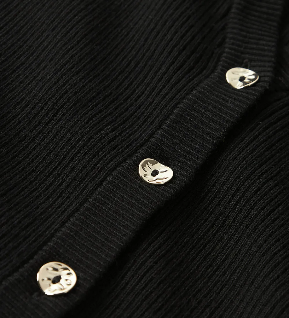 Stilfuld Name It cardigan i klassisk sort med ribstruktur over hele materialet.