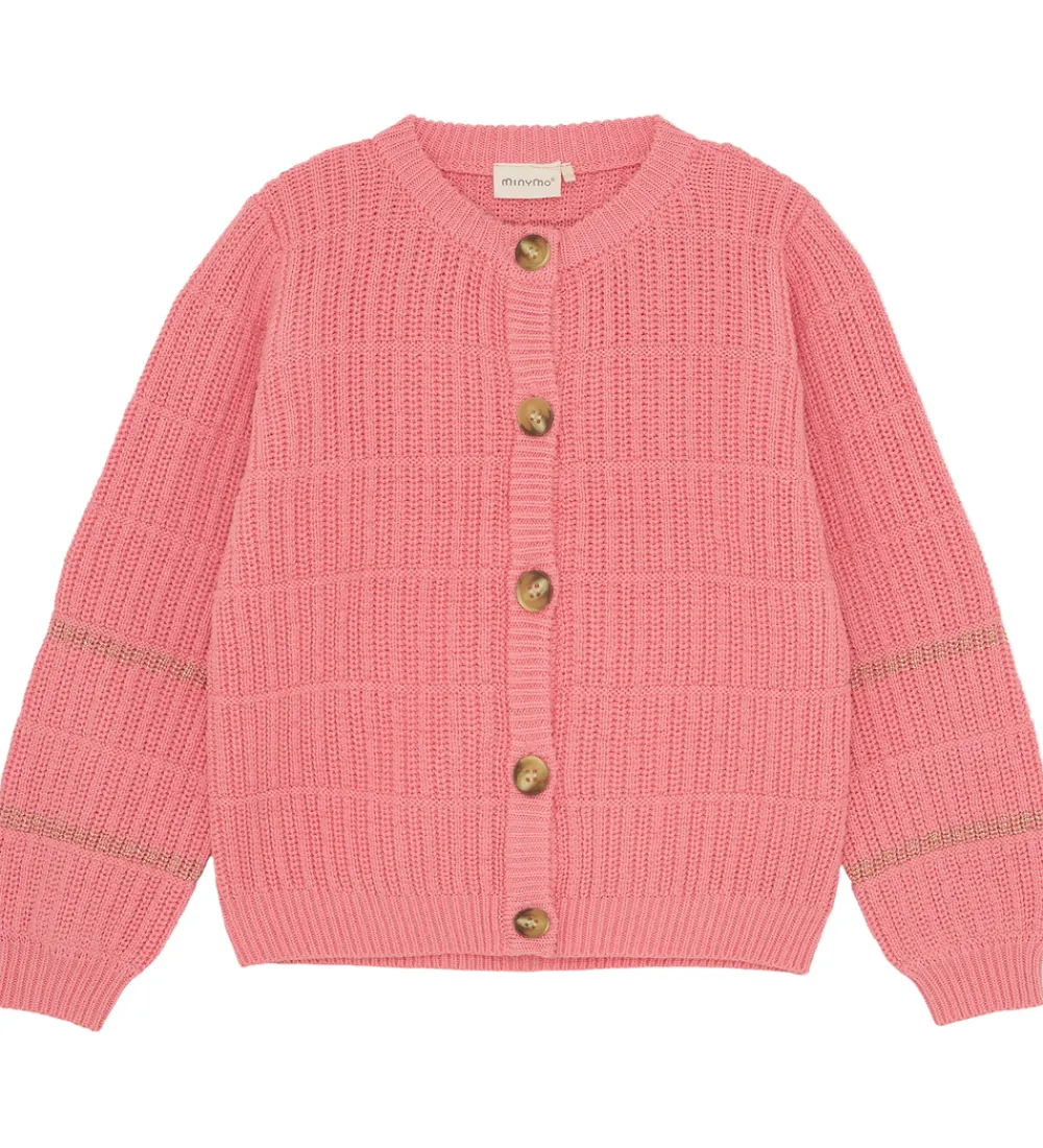 Cardiganen har en strikket struktur med fine, brede ribmønstre. De lange ærmer har en løs pasform med ribkanter ved håndleddene. Minymo cardiganen lukkes med knapper foran, der tilføjer et klassisk touch til designet.