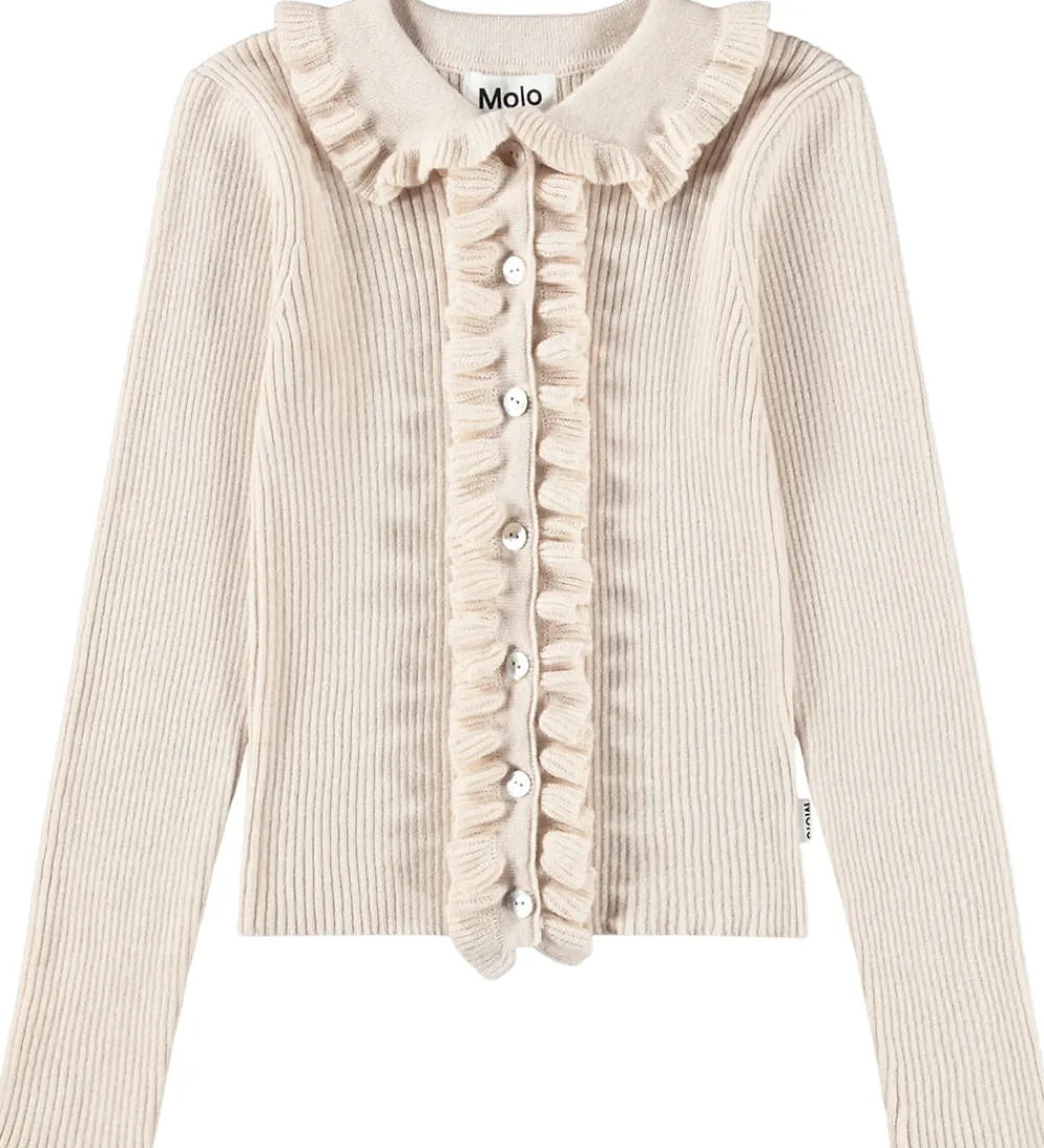 Stilfuld Molo cardigan i en beigemeleret og ribstrikket kvalitet og med dekorative flæsedetaljer langs knaplukningen og kraven. Knapperne har et flot perlemorslook og tilfører et klassisk touch.