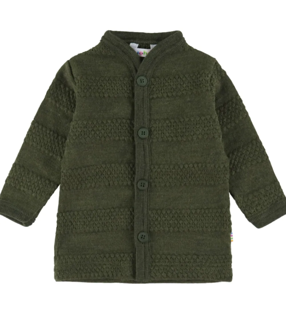 Flot Joha cardigan i mørkegrøn med flot strukturstrik. Cardiganen har gennemgående knapper foran og lange ærmer. Den er fremstillet af blødt merinould.