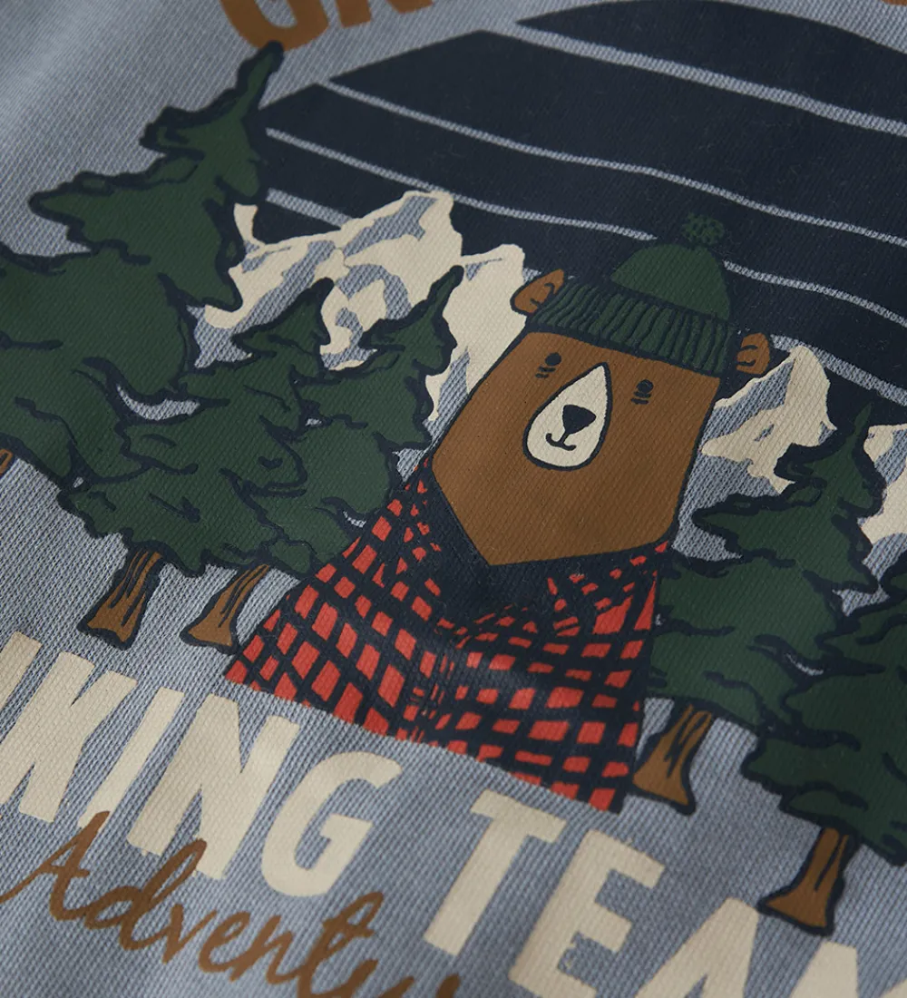 Skøn Name It cardigan i støvet blå med et lille print på venstre bryst af en bjørn med en bluse og hue på samt tekstprint. Cardiganen er i en lækker sweatkvalitet med en fastsyet hætte, lange ærmer og gennemgående lynlås fortil. Den har ribkanter i alle åbninger, og indvendigt er der blødt, børstet bomuld.