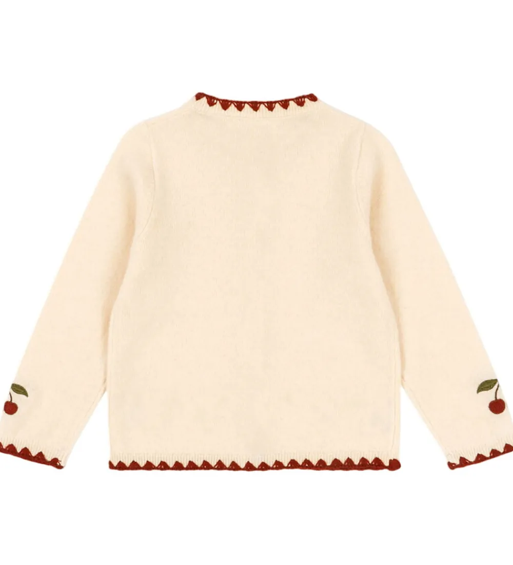 Skøn Konges Sløjd cardigan i creme med et pudderrosa skær med delikate kirsebærbroderier langs kanten fortil og yderst på ærmerne. Cardiganen har lange ærmer og en flot zigzag-kant i rød langs knaplukningen og nederst ved ærmerne. Konges Sløjd cardiganen lukkes med knapper, og den er lavet i en blød, strikket uldkvalitet.