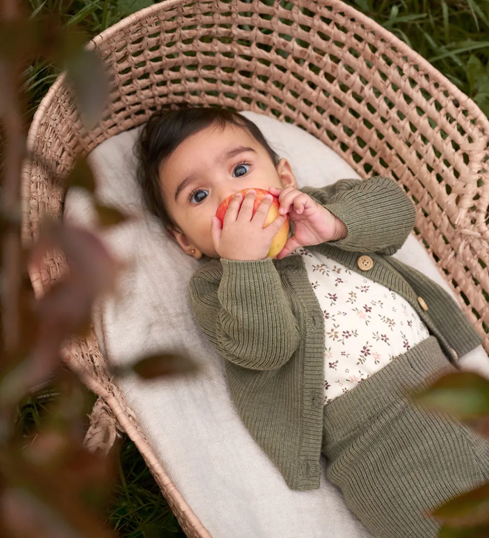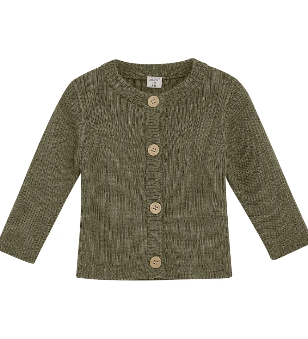 Smart CeLaVi cardigan i støvet armygrøn, og den er lavet af blødt og lækker merinould med ribstruktur.