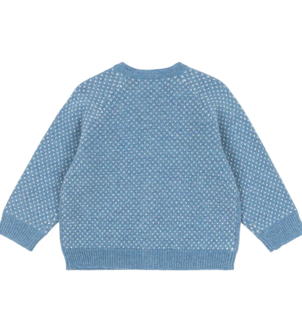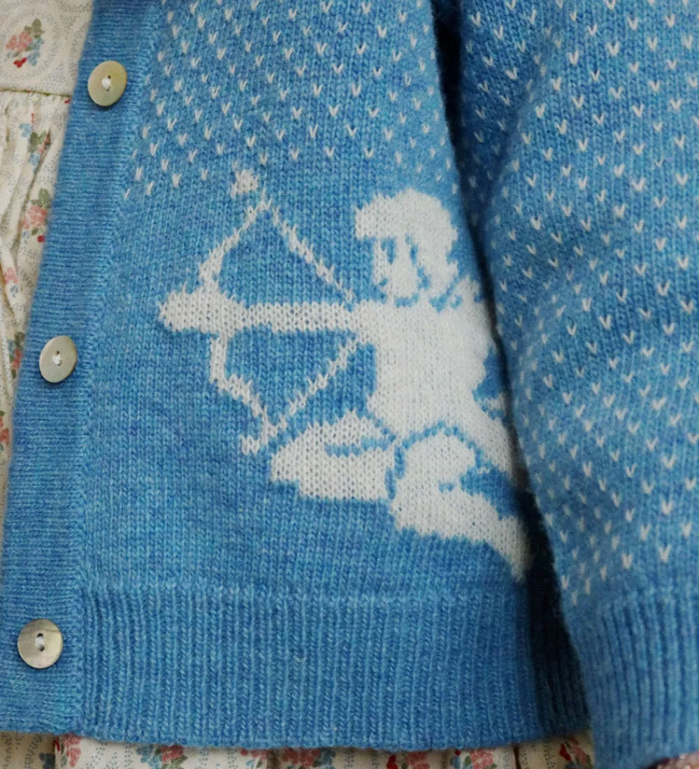 Bedårende Konges Sløjd cardigan i en blød blå nuance med elegante, hvide mønstre med fine prikker. Cardiganen har unikke motiver af bueskydende engle nederst, som tilføjer et særegent udtryk. Med praktiske knapper i fronten sikres let åbning og lukning. Den runde hals og afslappede pasform giver et behageligt udtryk. Konges Sløjd har skabt et stilrent design. Cardiganen er lavet i en strikket kvalitet i en blød uldblanding.