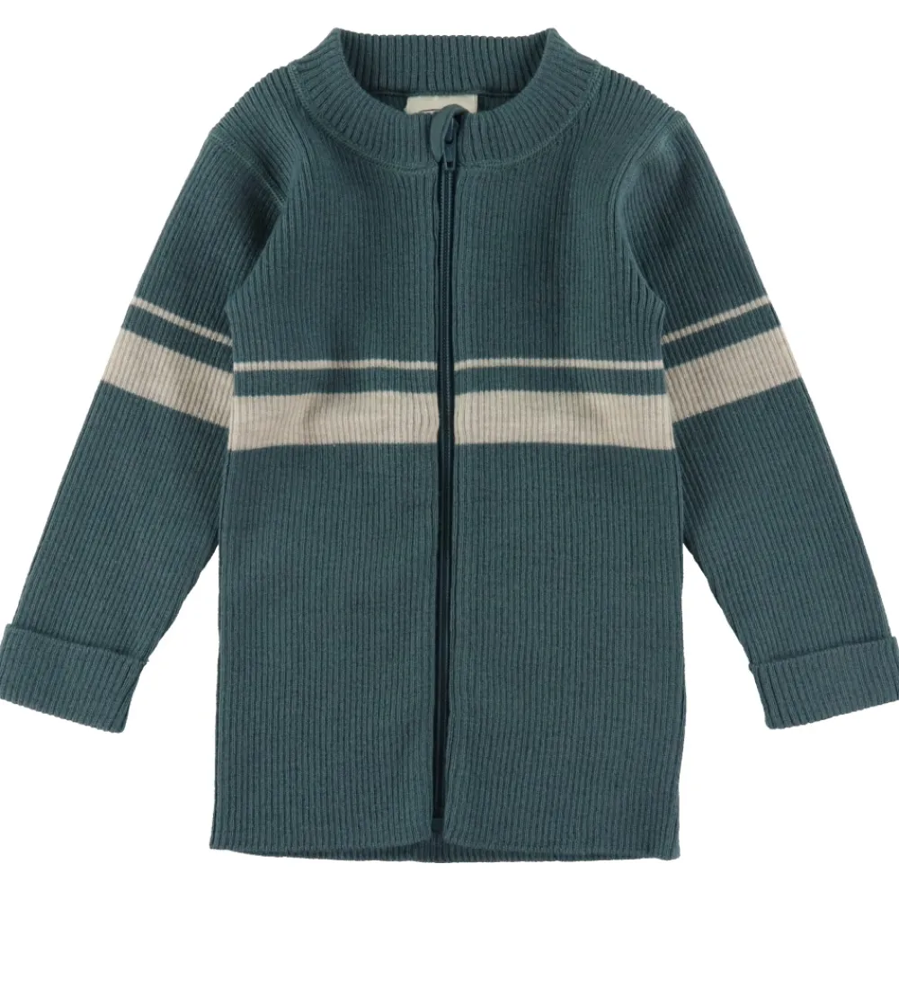 Fin Voksi cardigan i grøn uld med to vandrette striber i hvid samt en flot, strikket ribstruktur.
