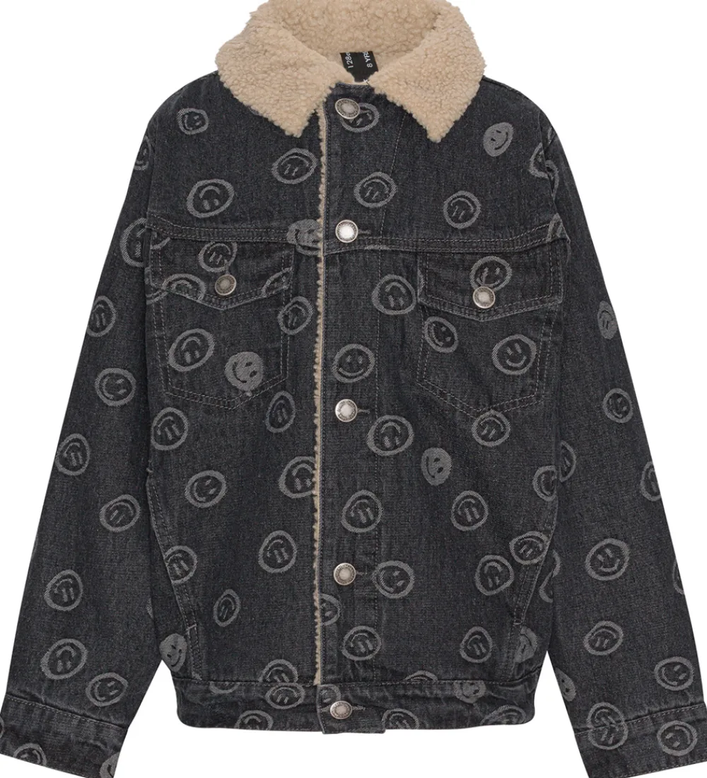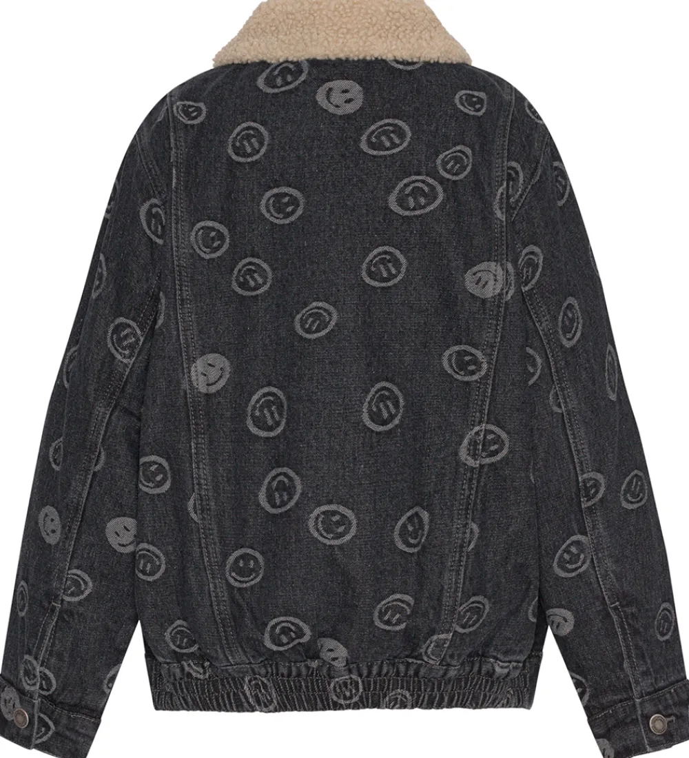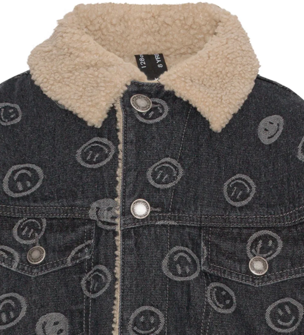 Skøn Molo jakke i sort denim med et forvasket look samt med et alloverprint af hvide smileyer. Denimjakken er med et blødt, beige teddyfor.