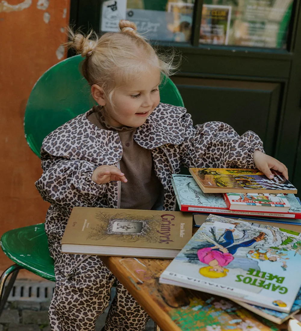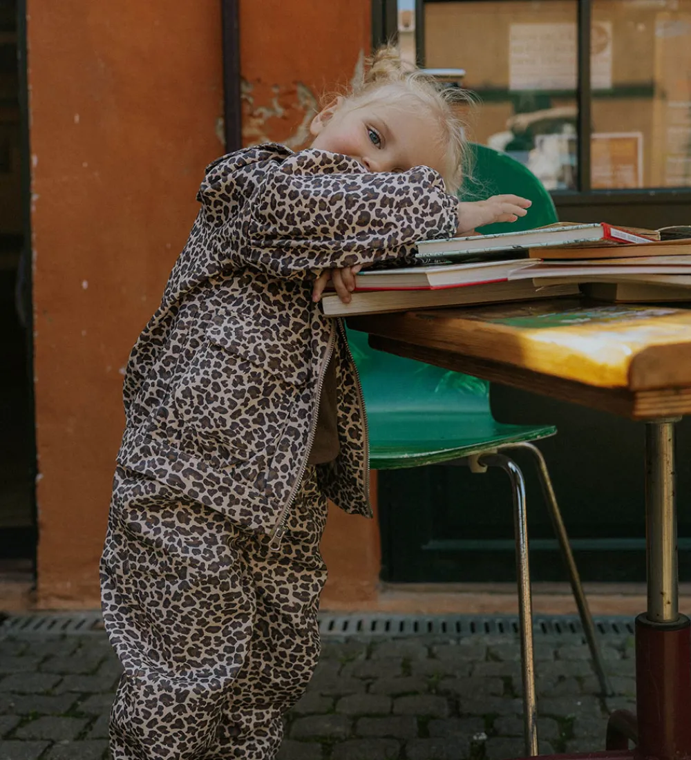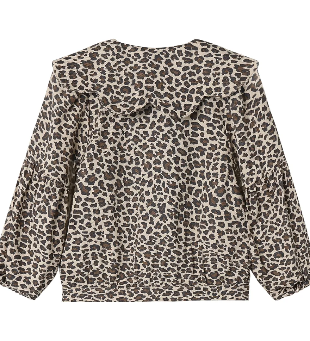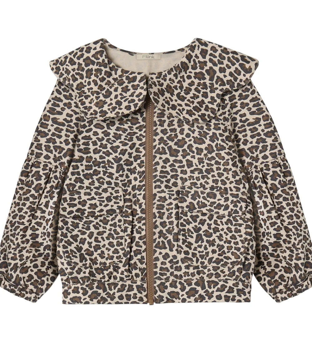 Stilfuld Fliink denimjakke med et spændende leopardprint i nuancer af brun og beige.