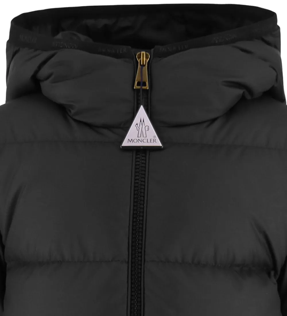 Lækker Moncler dunjakke i ensfarvet sort i en glatvævet kvalitet og med vandrette syninger, samt med et Moncler-logo på venstre arm.