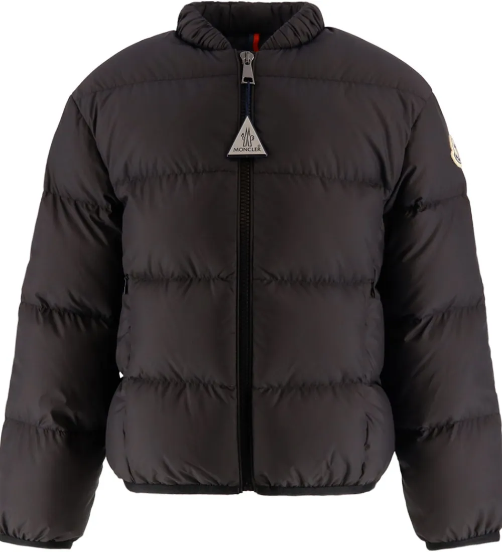Smart Moncler dunjakke i ensfarvet sort, og øverst på venstre ærme er der et filt-mærke med et Moncler-logo.