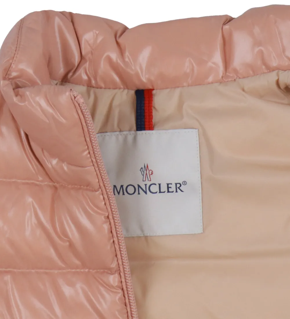 Elegant Moncler dunvest i en blød, lyserød nuance med et broderet logo foran.