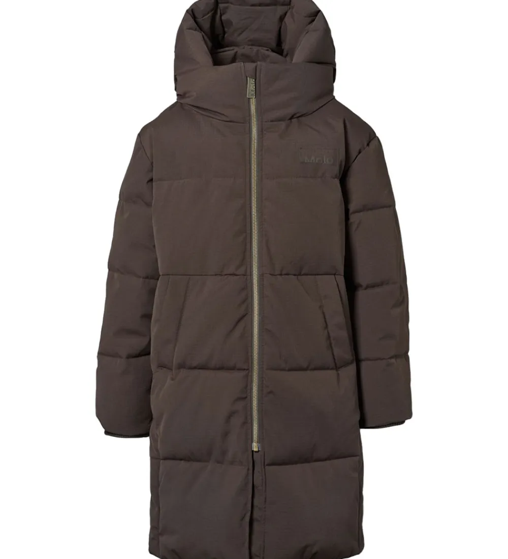 Dejlig Molo dynefrakke i ensfarvet mørkebrun. Dynefrakken har vandrette syninger og en logo-gummiapplikation på venstre bryst.