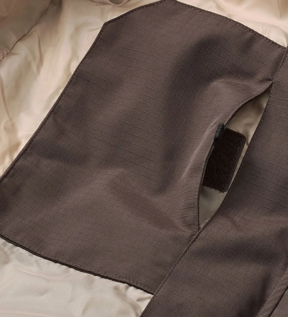 Molo dynefrakken har snefang og brede ribkanter i armåbningerne. Dynefrakken har to fleeceforede trykknaplommer fortil og desuden også en inderlomme i venstre side med velcrolukning.