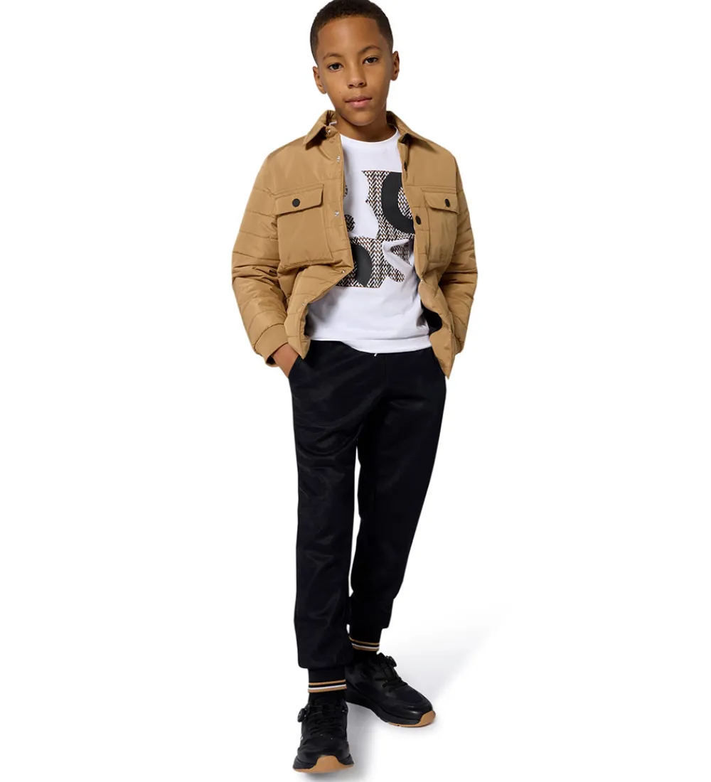 BOSS dynejakken har en klassisk krave i halsåbningen, og ærmerne har brede ribkanter. Dynejakken lukkes med trykknapper, og i siderne er der praktiske lommer. Fortil sidder der to brystlommer med klap og en trykknap. Dynejakken har et sort, glatvævet for, og den har en lun polyestervattering. Dynejakken har fået en vandafvisende behandling, så vand ikke så let trænger igennem.
