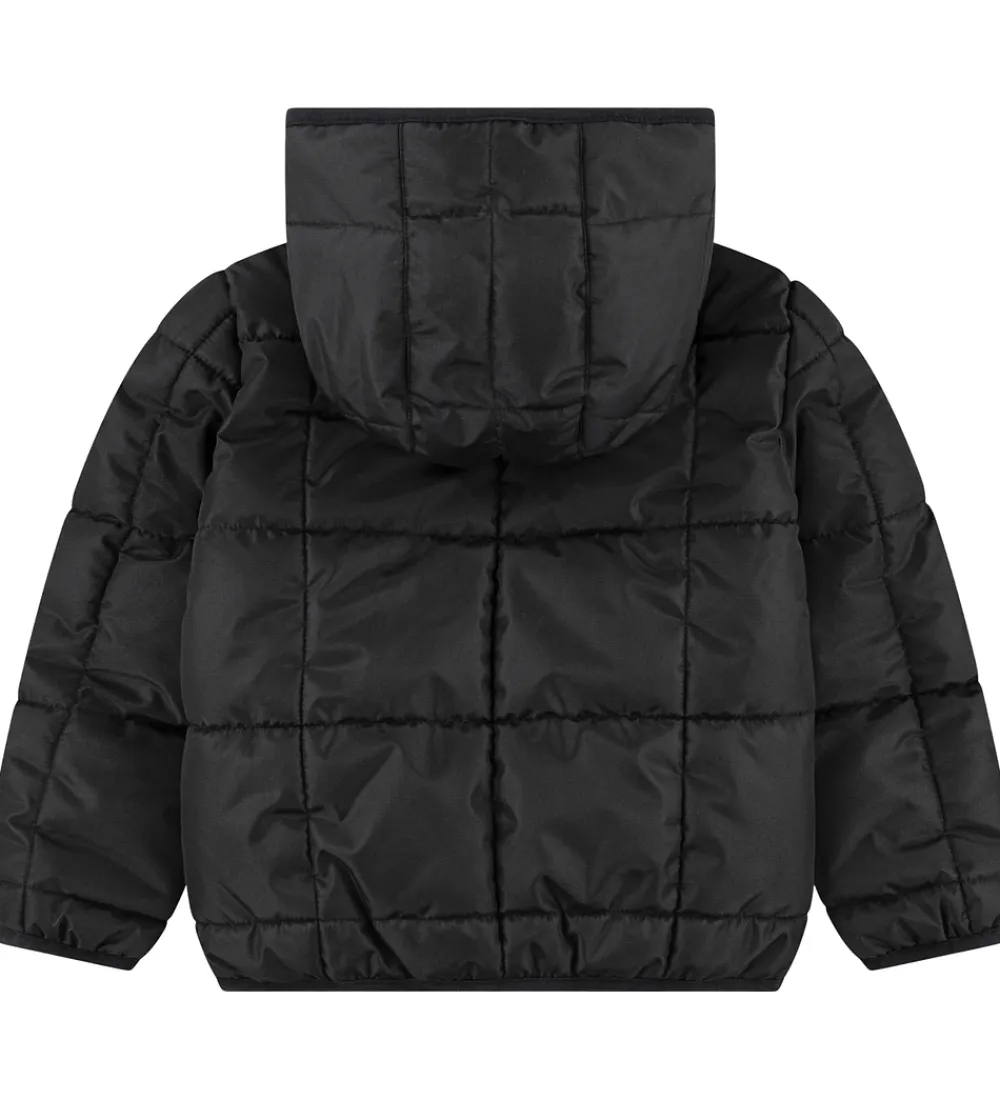 Flot Jordan dynejakke i sort med grå lynlåse og et broderet, gråt logo på venstre bryst samt et gummilogo på venstre ærme.