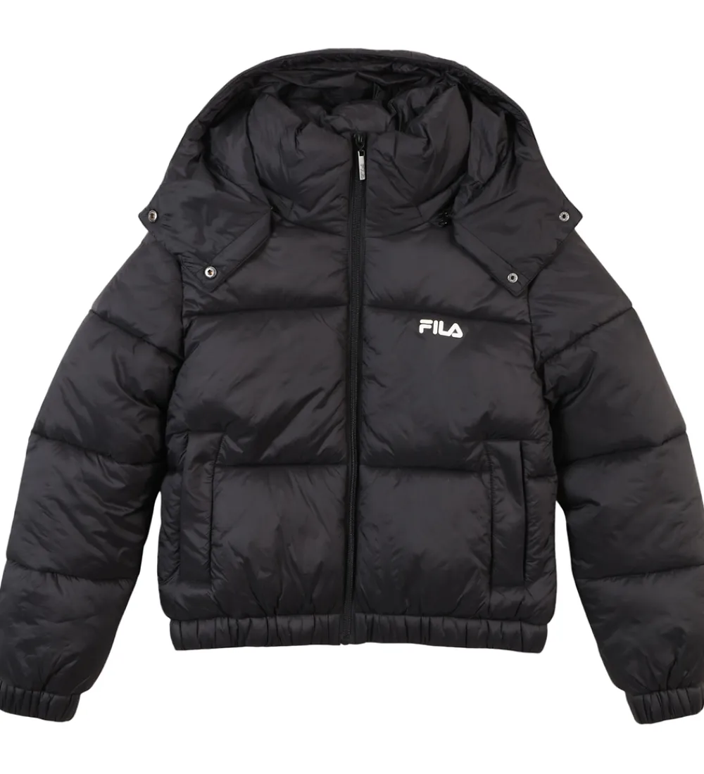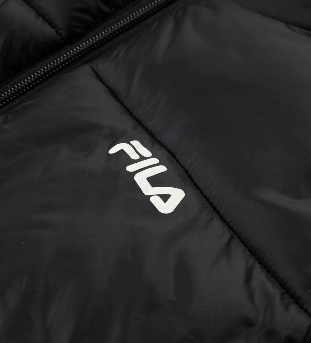 Elegant Fila dynejakke i klassisk sort med vandrette syninger og et diskret, hvidt logo på venstre bryst.