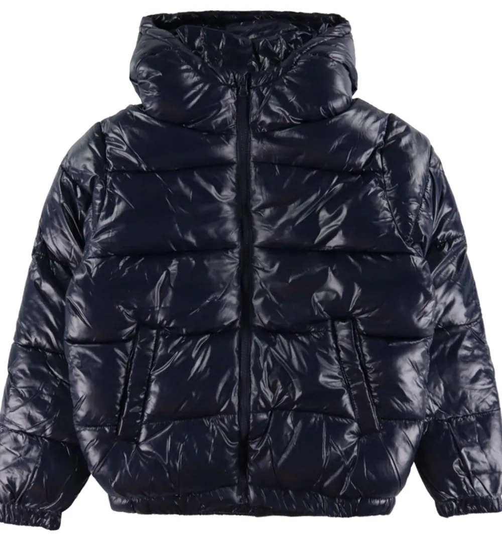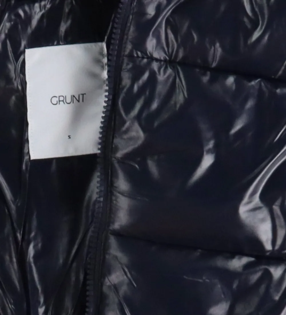 Elegant Grunt dynejakke i en blank, navy farve. De vandrette syninger tilføjer ekstra visuel dybde, som fremhæver stoffets struktur.