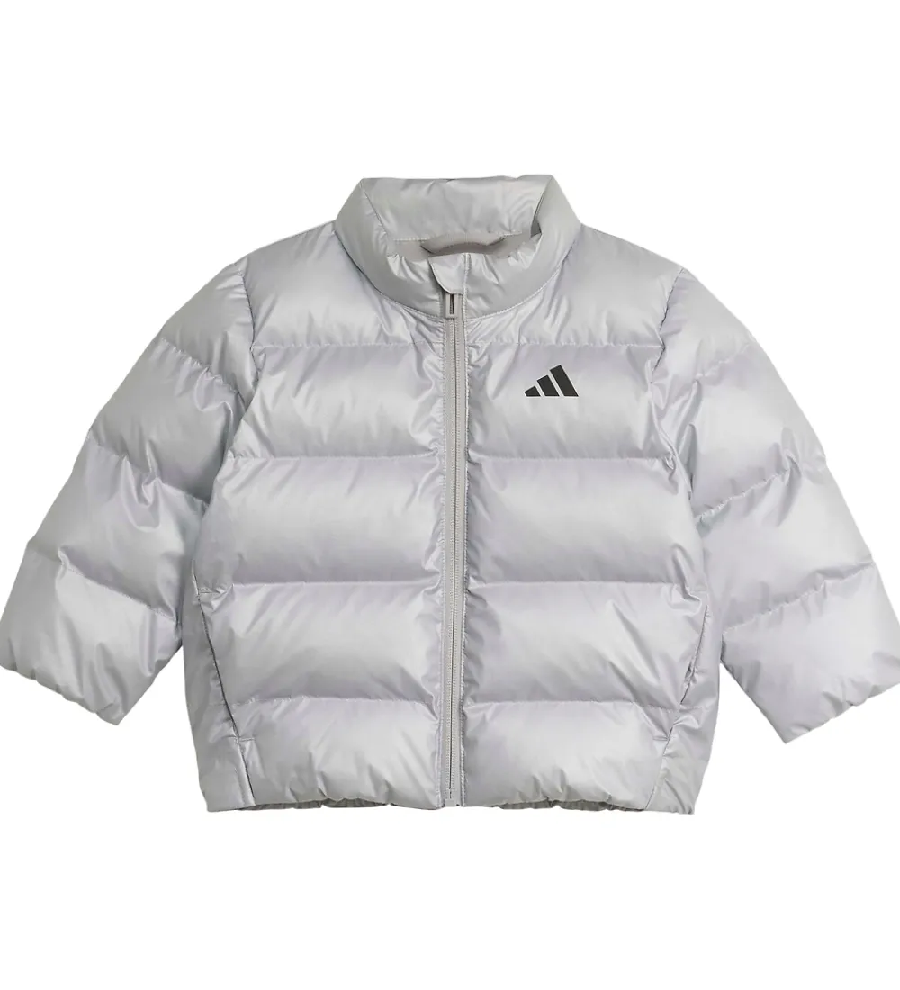 Smart adidas Performance dynejakke i metallisk sølv med vandrette syninger og et refleks logoprint på venstre bryst.