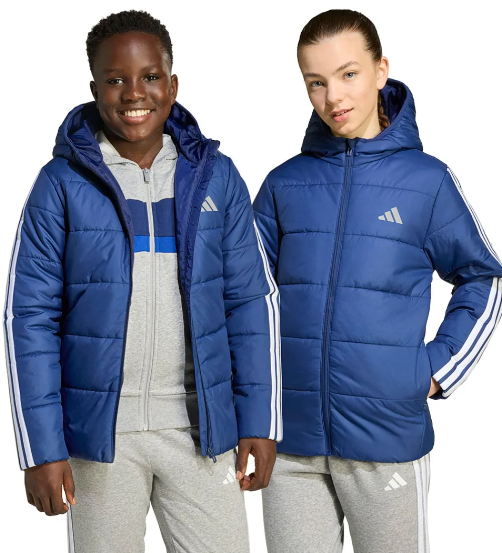 Lækker adidas Performance dynejakke i blå med vandrette syninger og et refleks logoprint på venstre bryst. Ned ad ærmerne er de karakteriske striber i hvid.