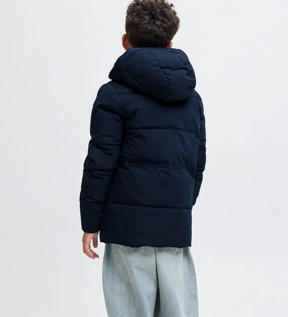 Stilren Jack & Jones dynejakke i navyblå. Dynejakkens struktur omfatter vandrette syninger, der giver et moderne udtryk.