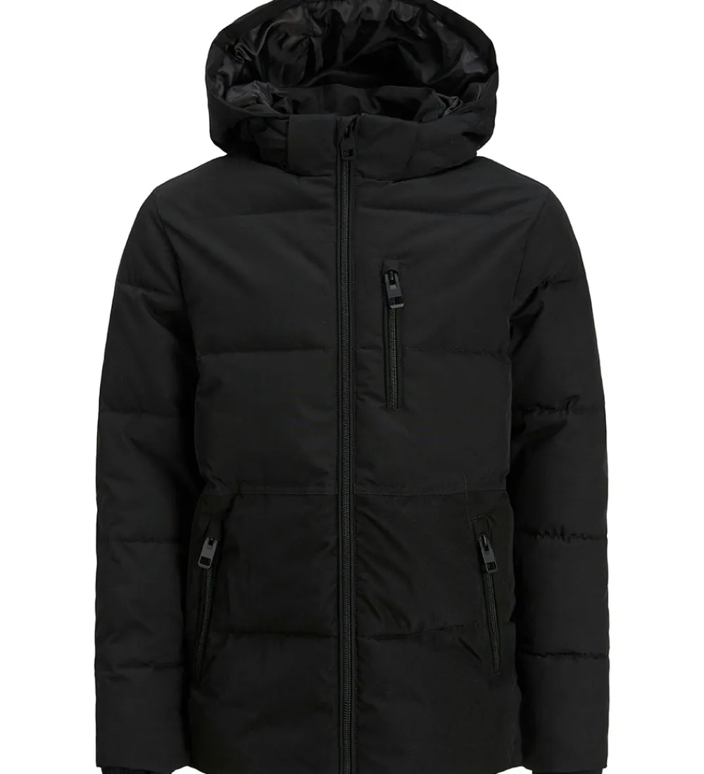Stilren Jack & Jones dynejakke i klassisk sort design. Dynejakkens struktur omfatter vandrette syninger, der giver et moderne udtryk.