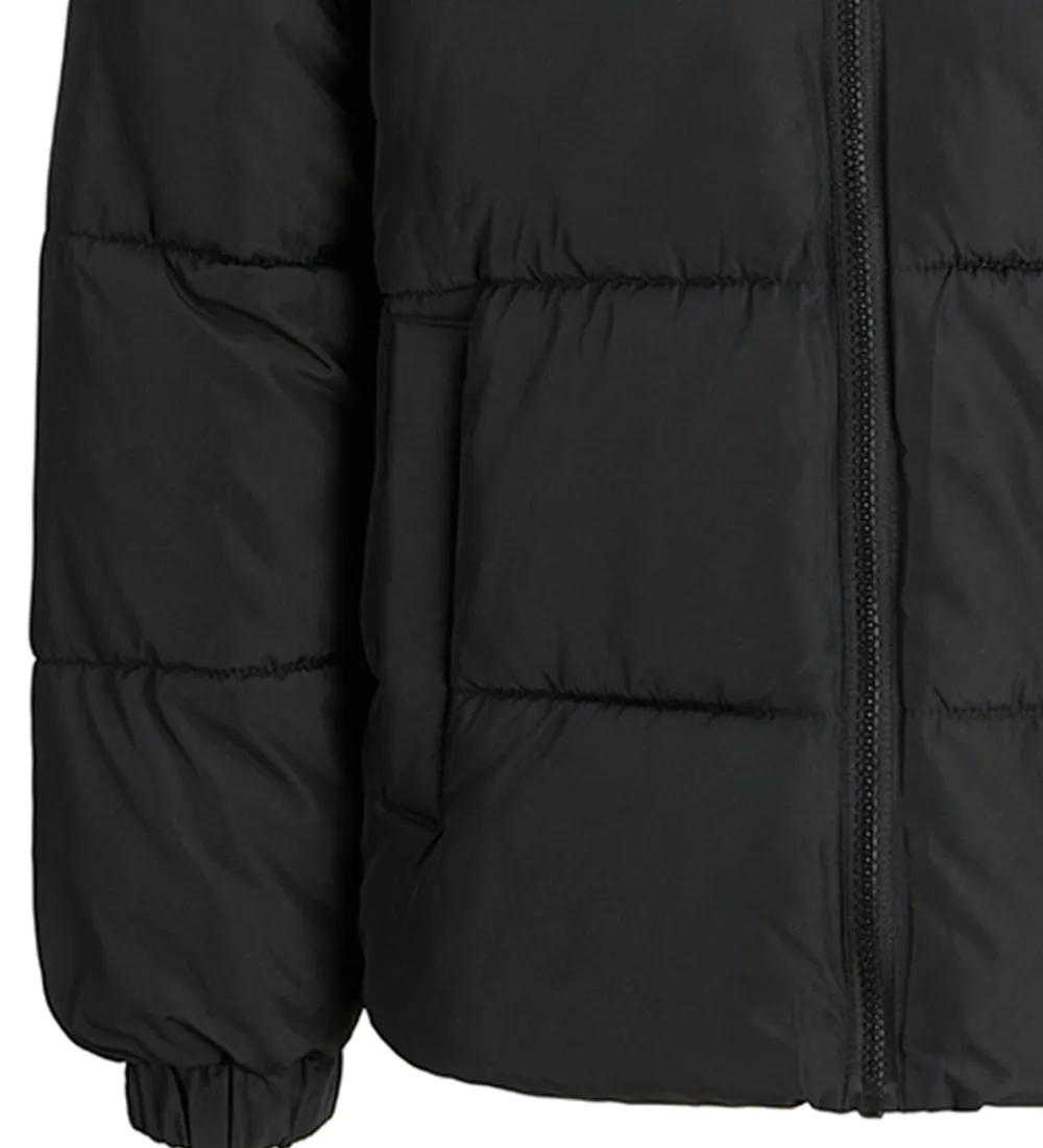 Flot Jack & Jones dynejakke i sort med vandrette syninger og et hvidt logoprint på venstre bryst.