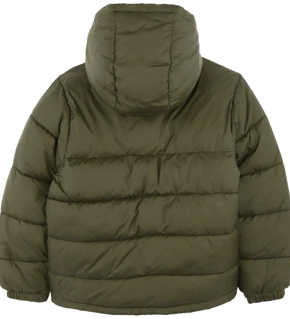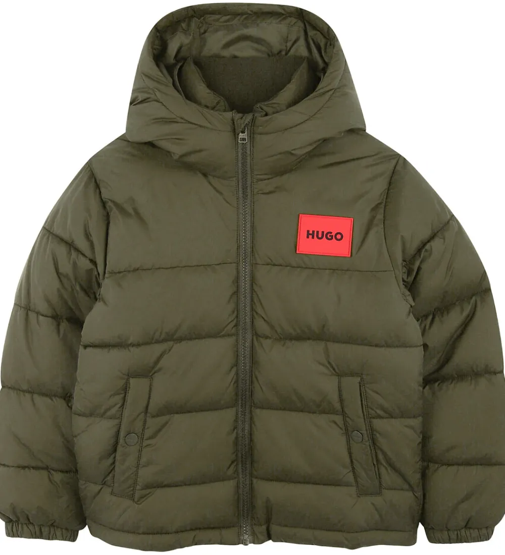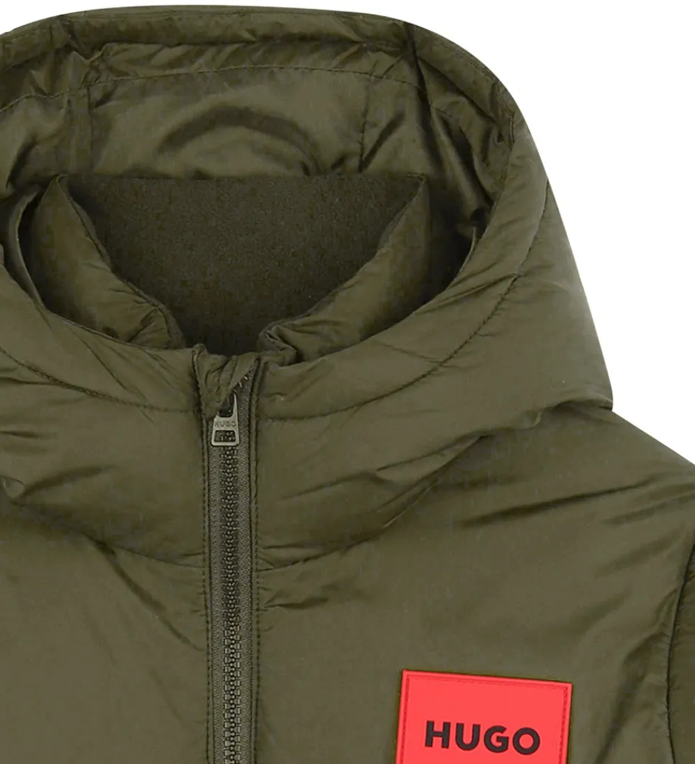 Smart HUGO dynejakke i ensfarvet armygrøn med et rødt logo på brystet. Dynejakken har en fast hætte, og ærmerne har elastikkanter.