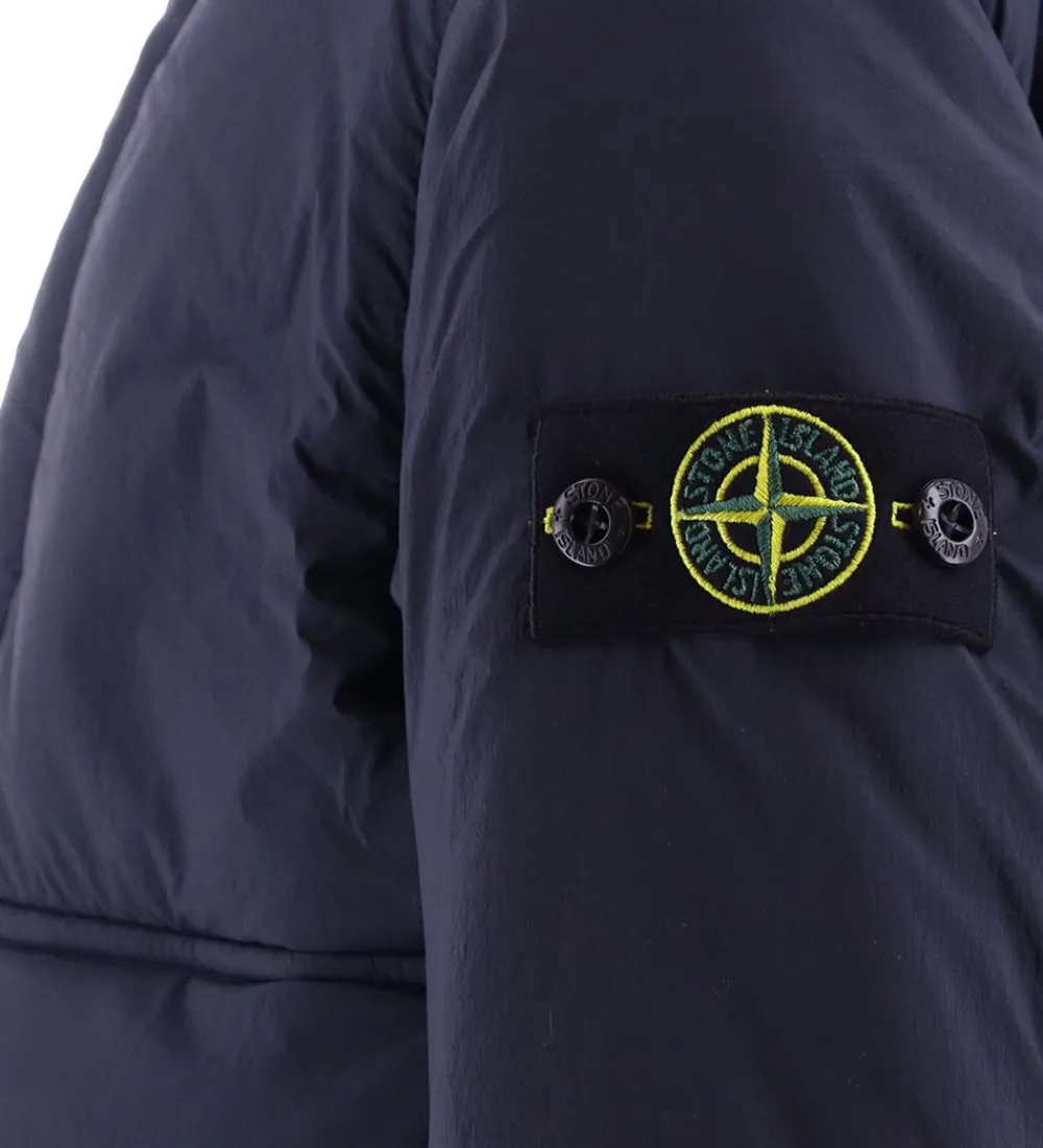 Flot Stone Island dynejakke i ensfarvet navy, og øverst på venstre ærme sidder det ikoniske logomærke fast med knapper.