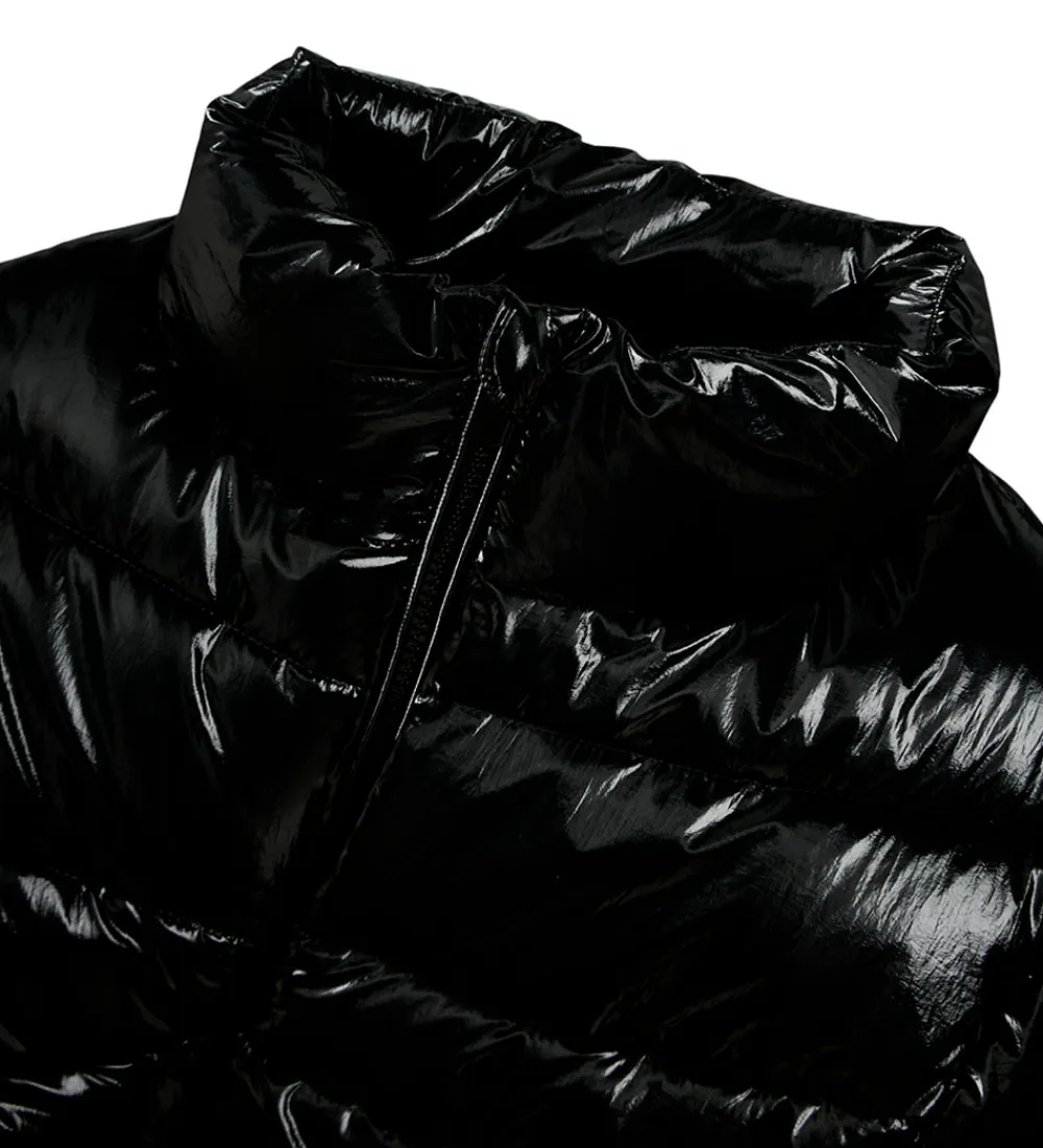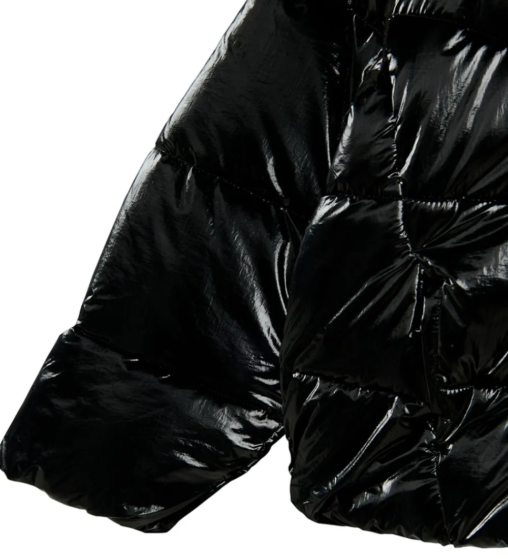Stilfuld Name It dynejakke i skinnende sort, der giver et moderne og elegant udtryk. Dynejakken har brede vandrette syninger, der skaber en fyldig og blød struktur.