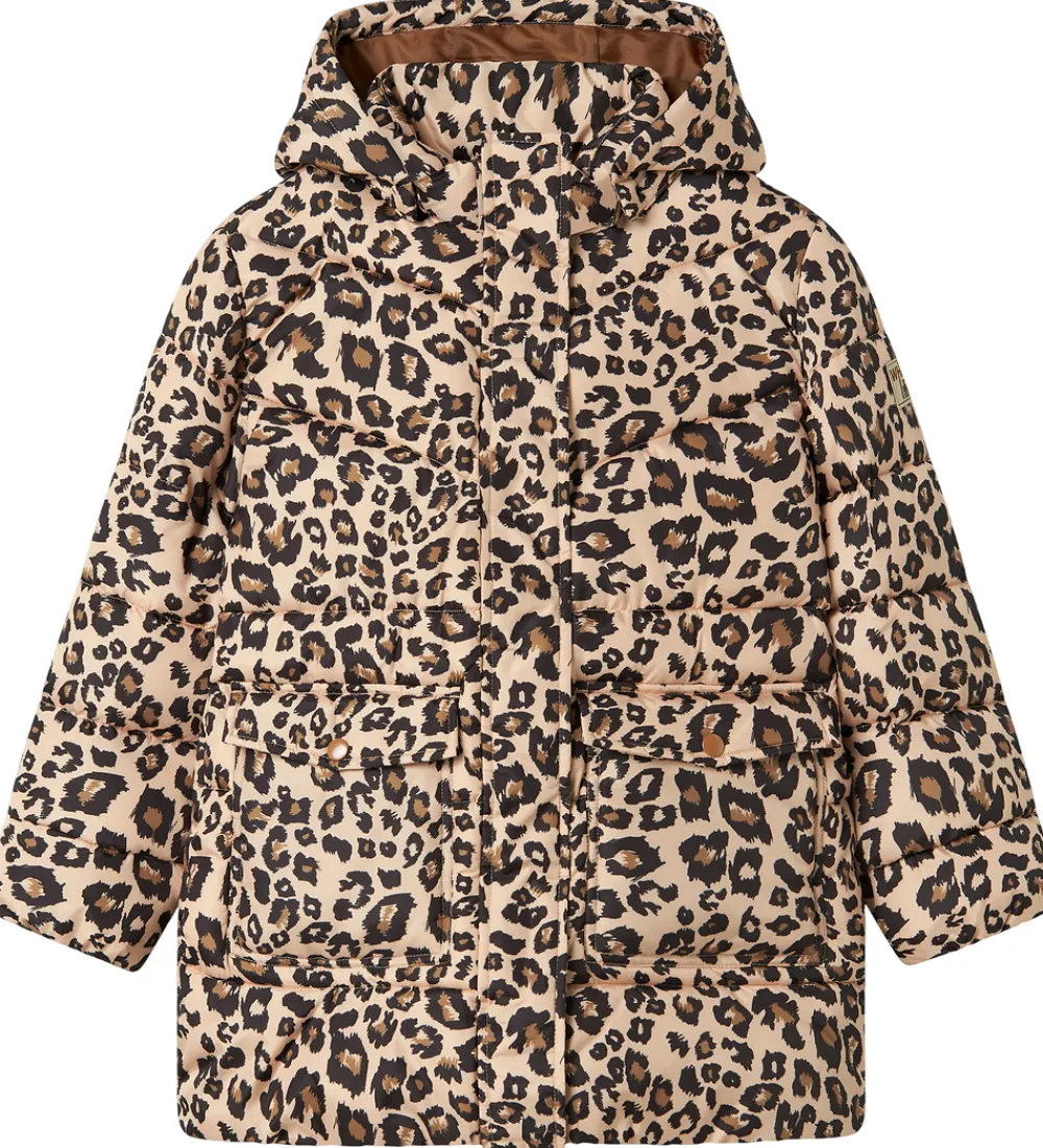 Flot Name It dynejakke i leopardprint med vandrette syninger og velplacerede reflekser.