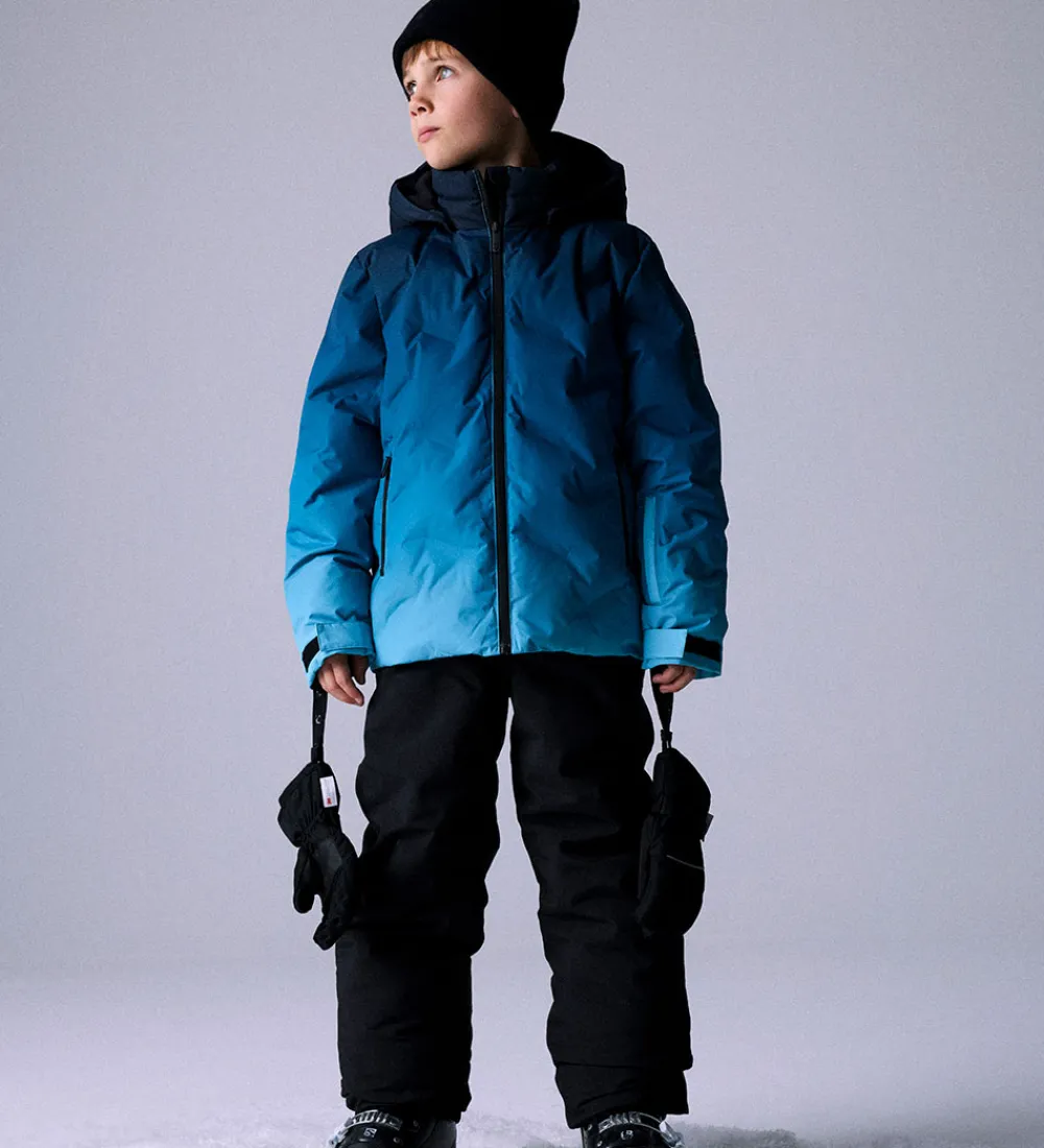 Name It dynejakken har en aftagelig hætte, som fæstnes omkring halskraven med trykknapper og velcro. Ærmerne er med snefang, velcrojusteringer og brede, strækbare kanter med hul til tommelfingeren.