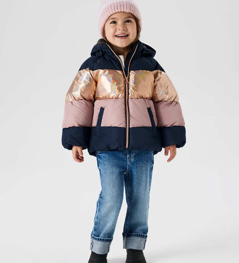 Lækker Name It dynejakke med brede striber i navyblå, rosa og skinnende guld. Dynejakken er med vandrette syninger.