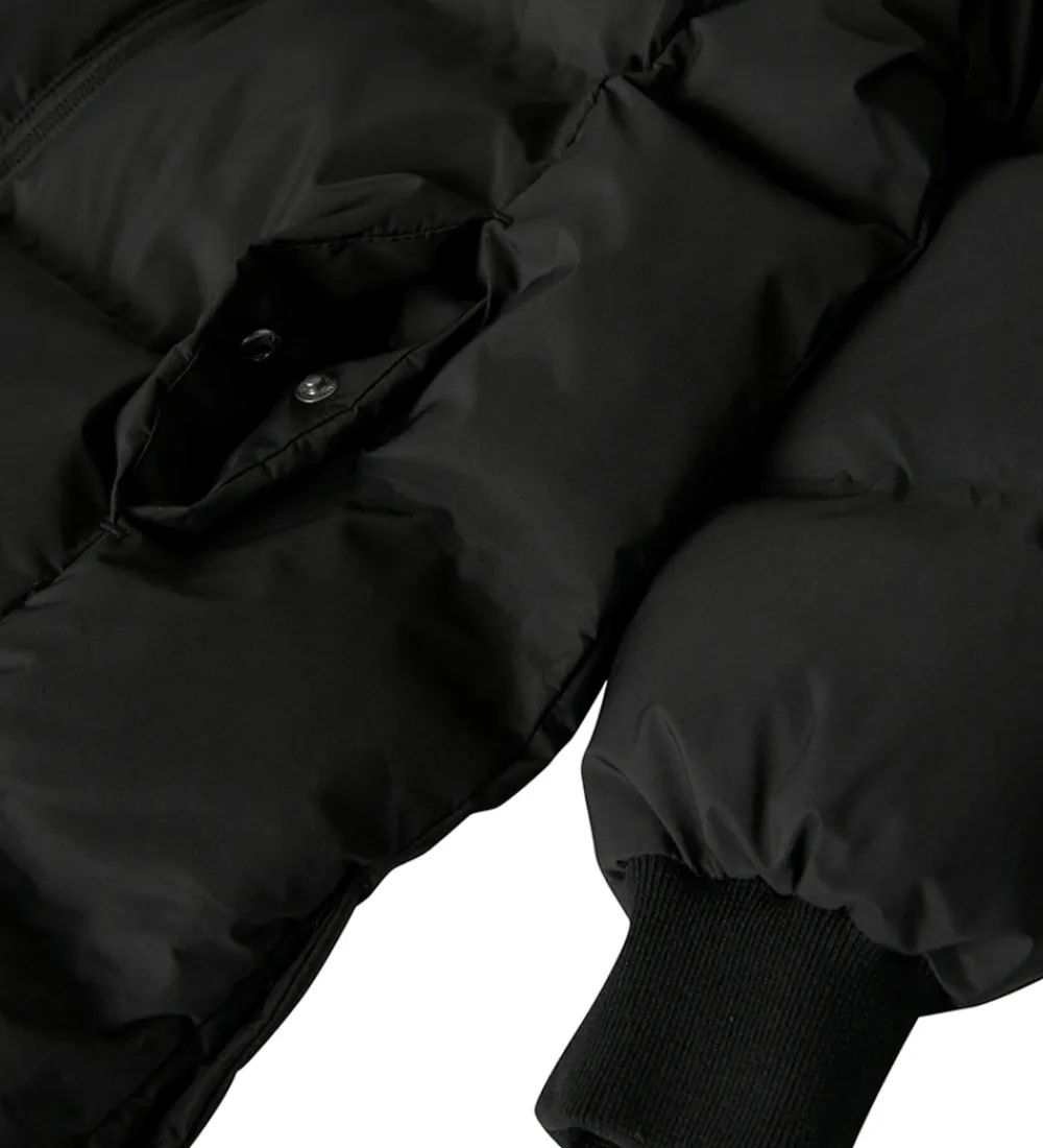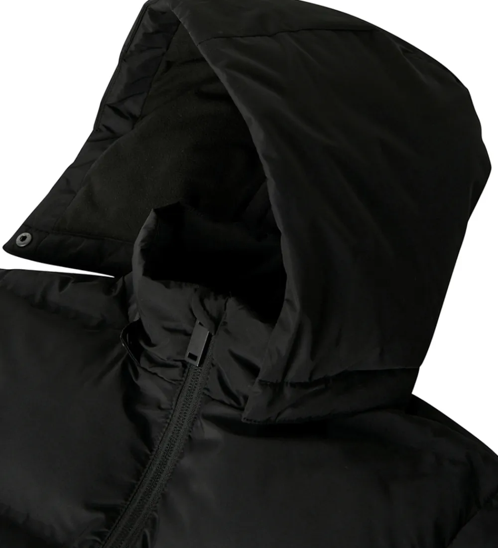 Name It dynejakke har en aftagelig hætte, som sidder fast langs kraven med trykknapper. Dynejakken lukkes fortil med en gennemgående lynlås med hagebeskytter og indvendig vindstolpe. Den har brede ribkanter i ærmerne og en lomme i hver side, som kan lukkes med trykknapper. Nederst i siderne er der trykknapper, som kan knappes op, hvis man f.eks. skal cykle.