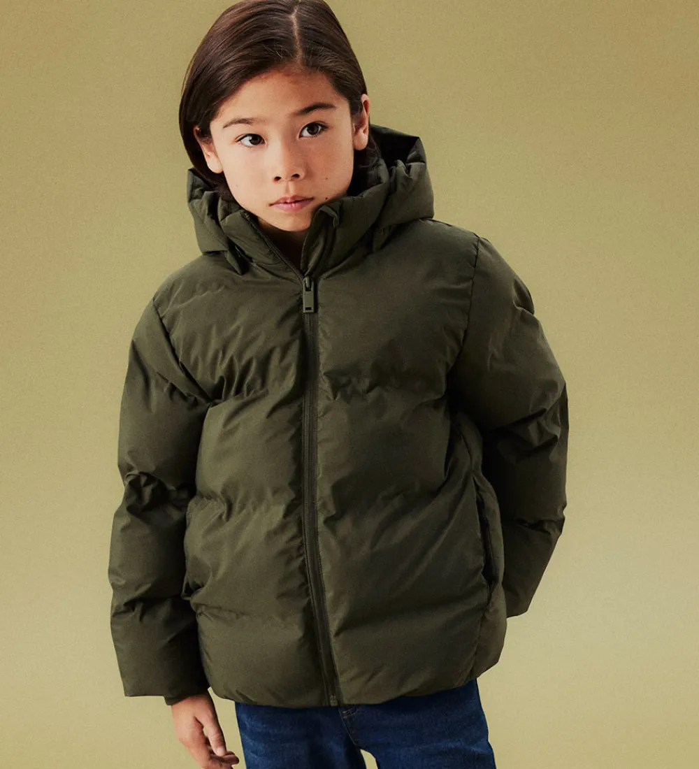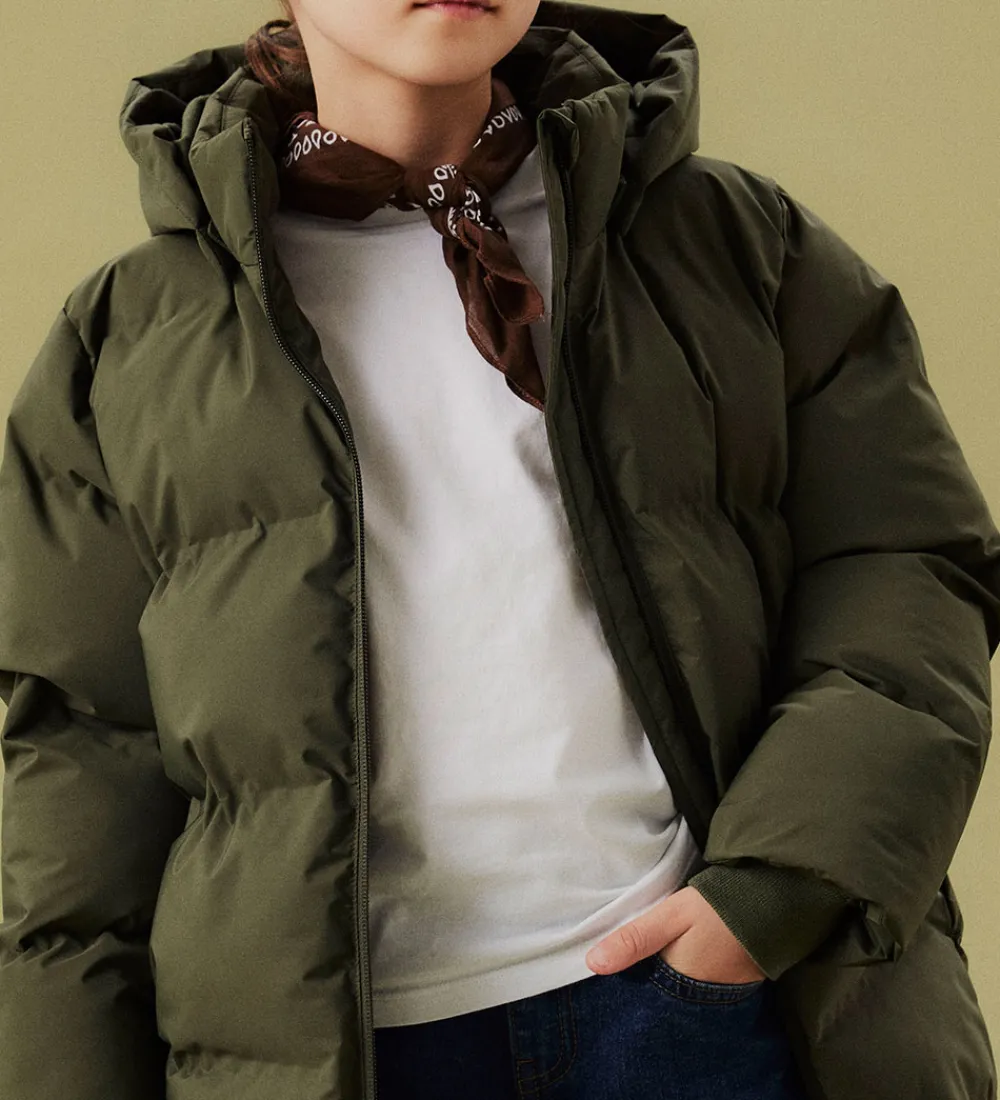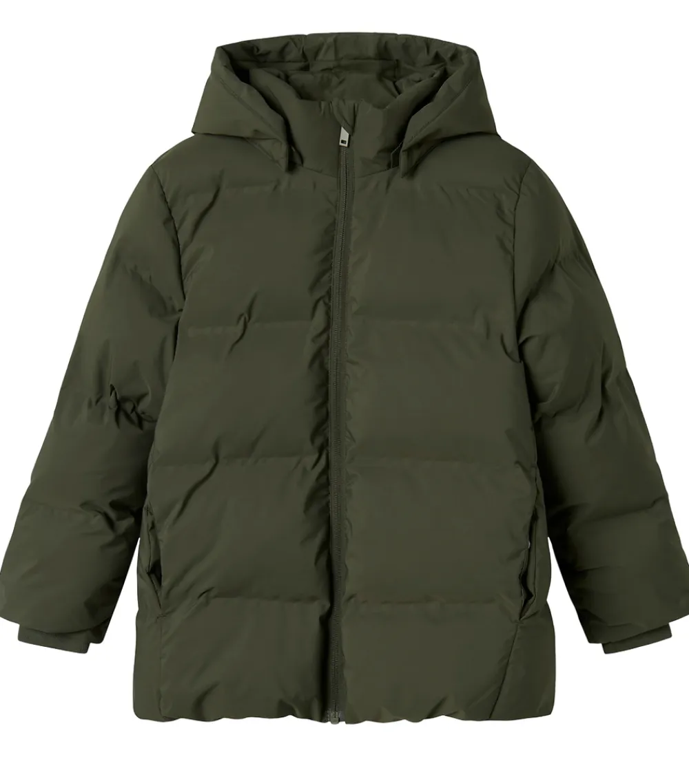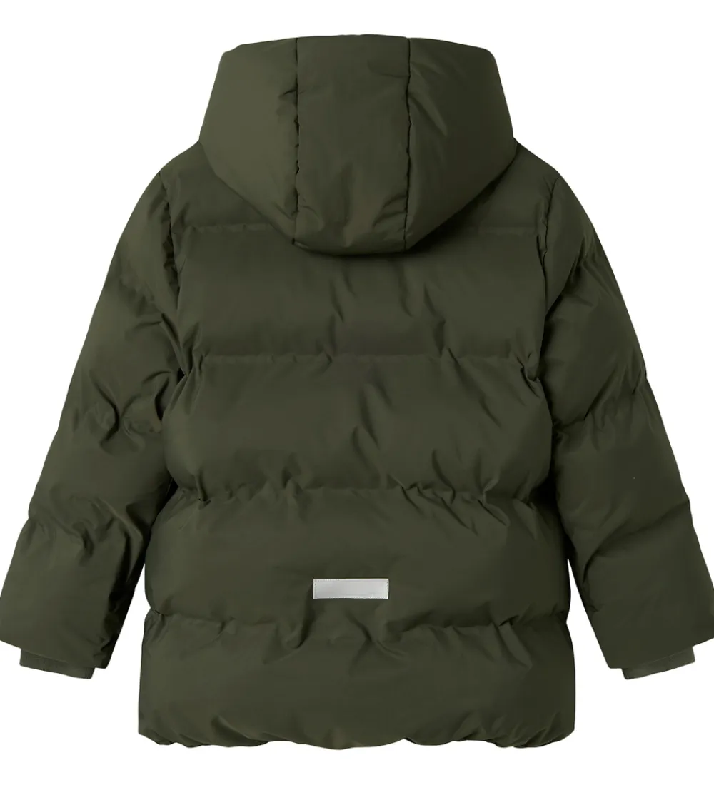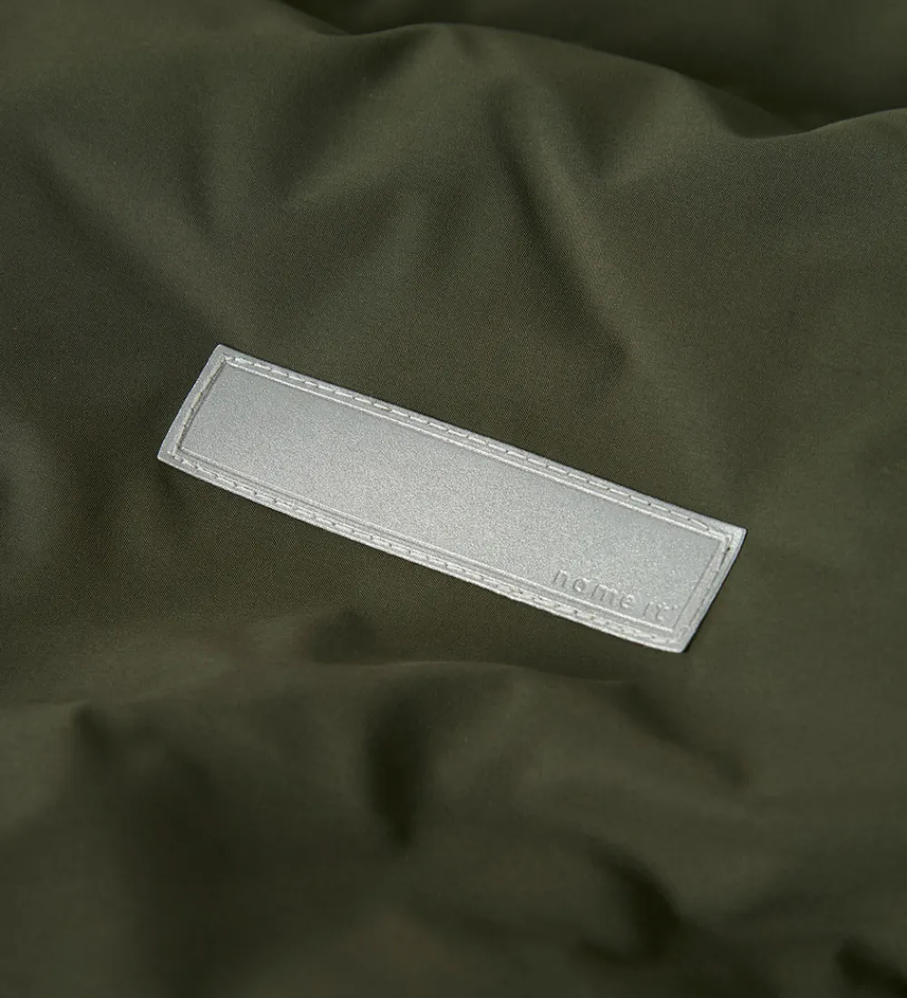 Flot Name It dynejakke i mørkegrøn med en indpræget struktur i vandrette linjer. Dynejakken er med praktiske reflekser.