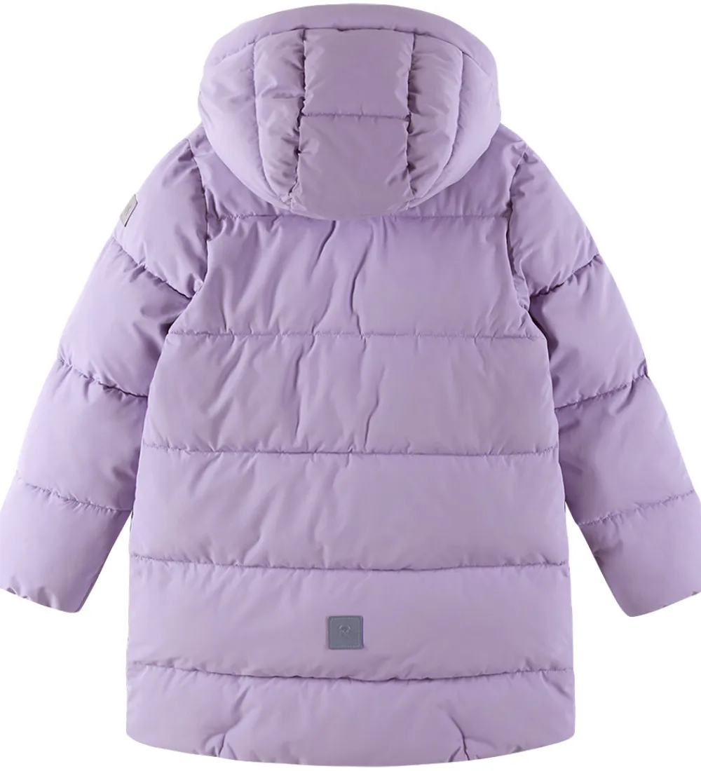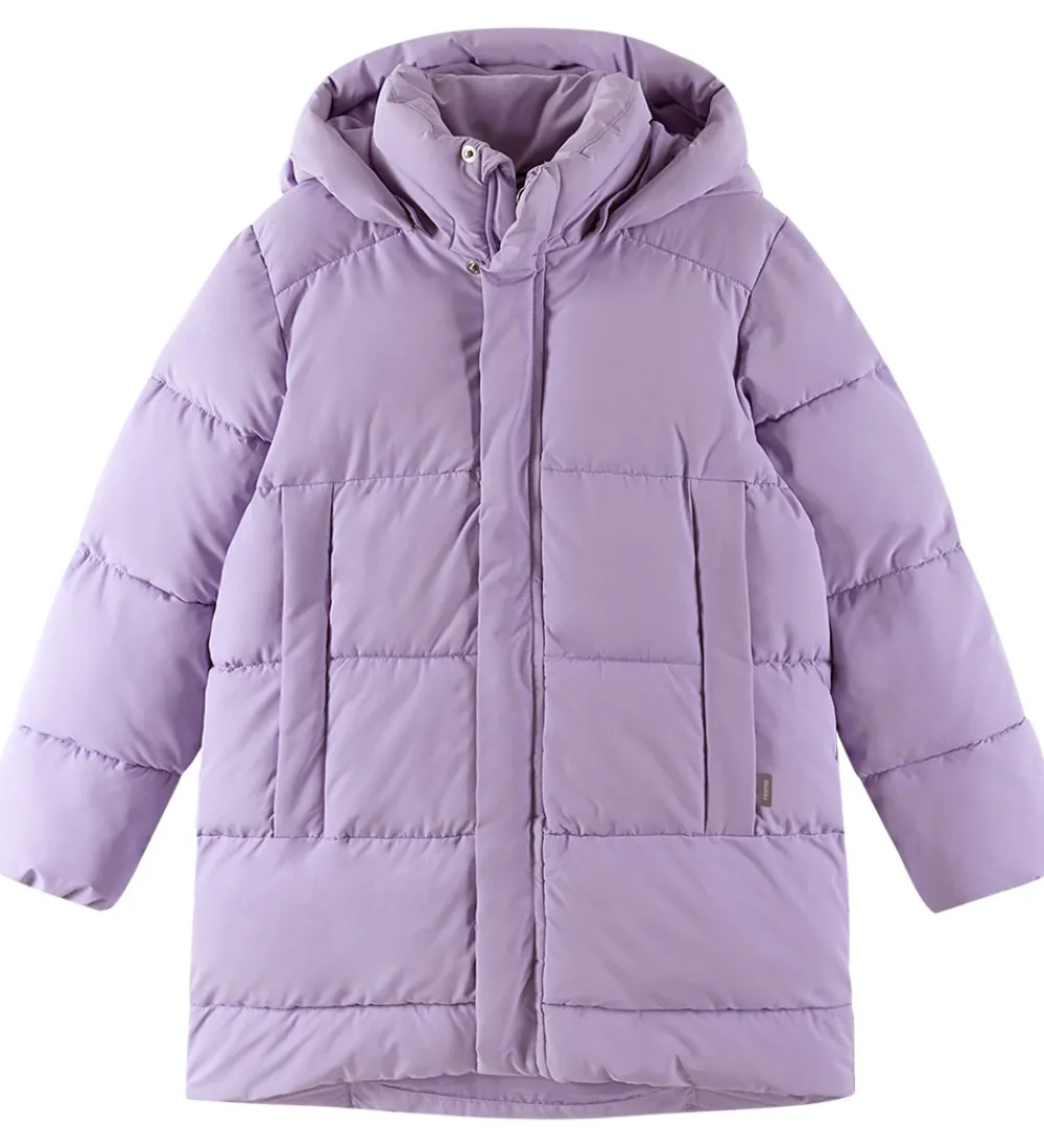 Reima dynejakken har en aftagelig hætte, som sidder fast med skjulte trykknapper omkring den høje halskrave, og ærmerne har praktiske elastikanter i åbningerne.