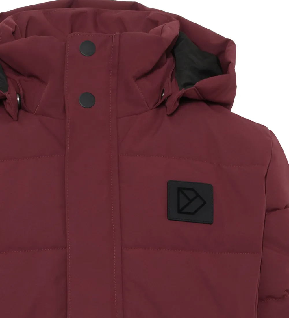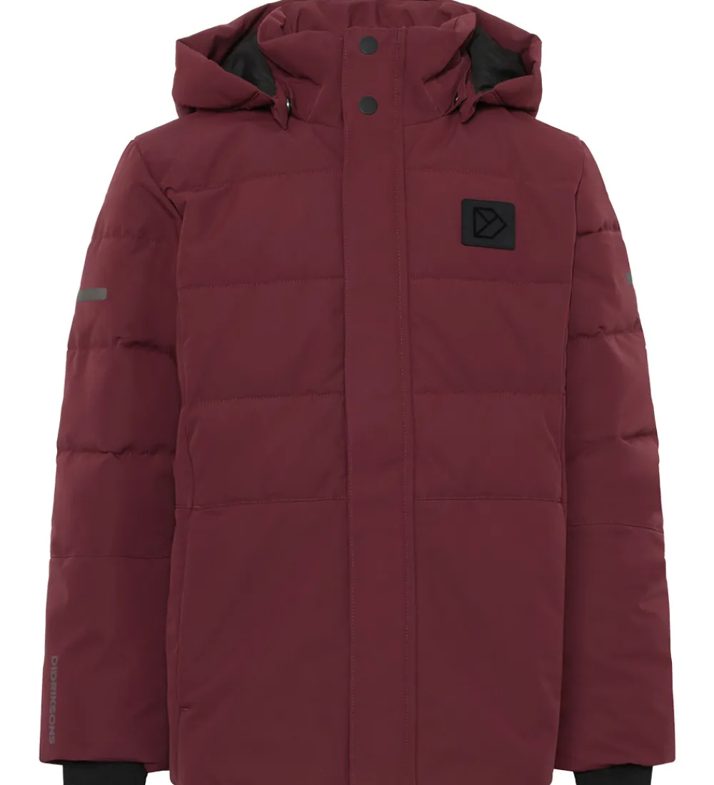 Skøn Didriksons dynejakke i en flot, mørkerød nuance med vandrette syninger og en sort logoapplikation på brystet samt velplacerede reflekser.
