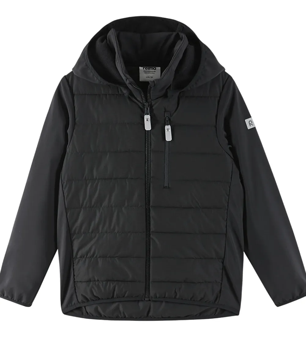 Reima dynejakken har en aftagelig hætte, som sidder fast med trykknapper, og den har smalle, elastiske kanter. Dynejakken lukkes med en lynlås med hagebeskytter, og i venstre side har den en brystlomme, som lukkes med en lodret lynlås.
