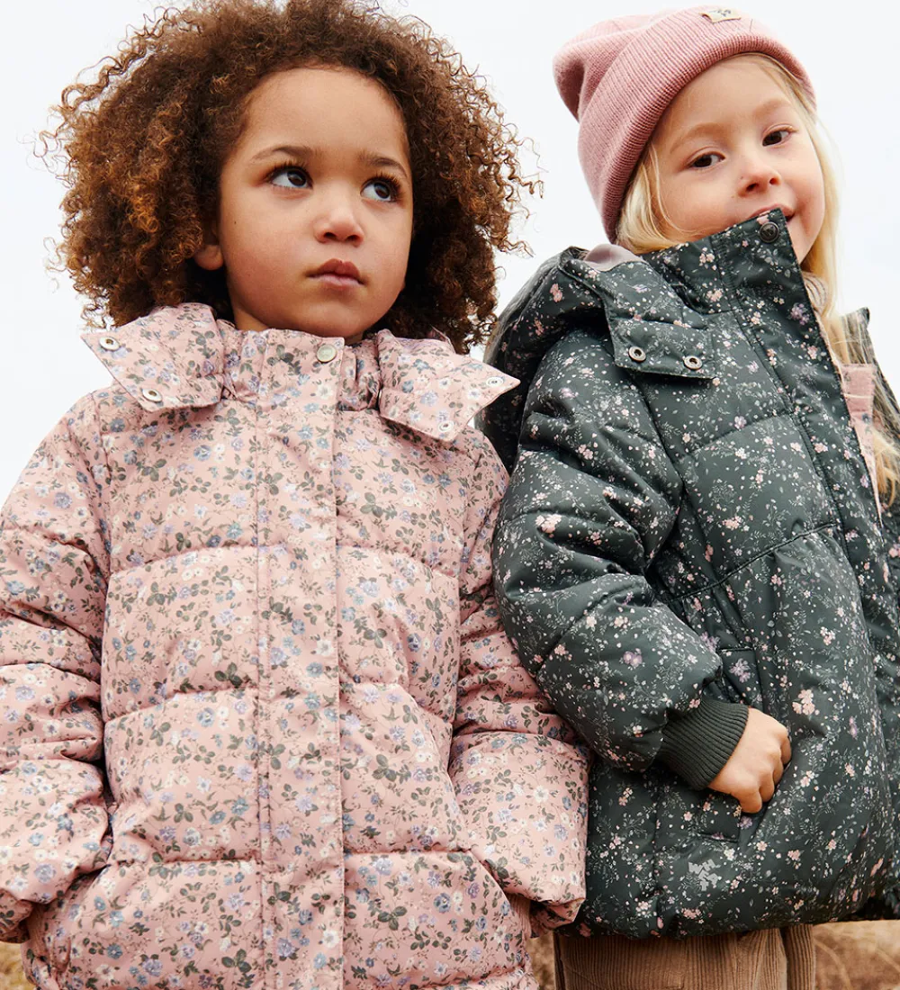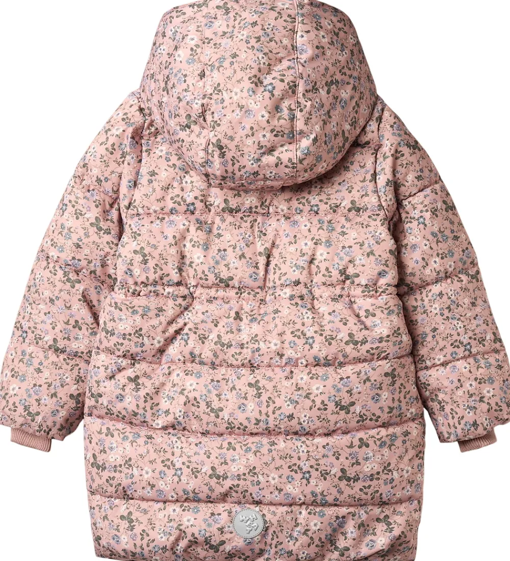 Lækker Wheat dynejakke i rosa med et alloverblomsterprint i lilla, blå, hvide og grønne farver. Dynejakken har vandrette syninger.