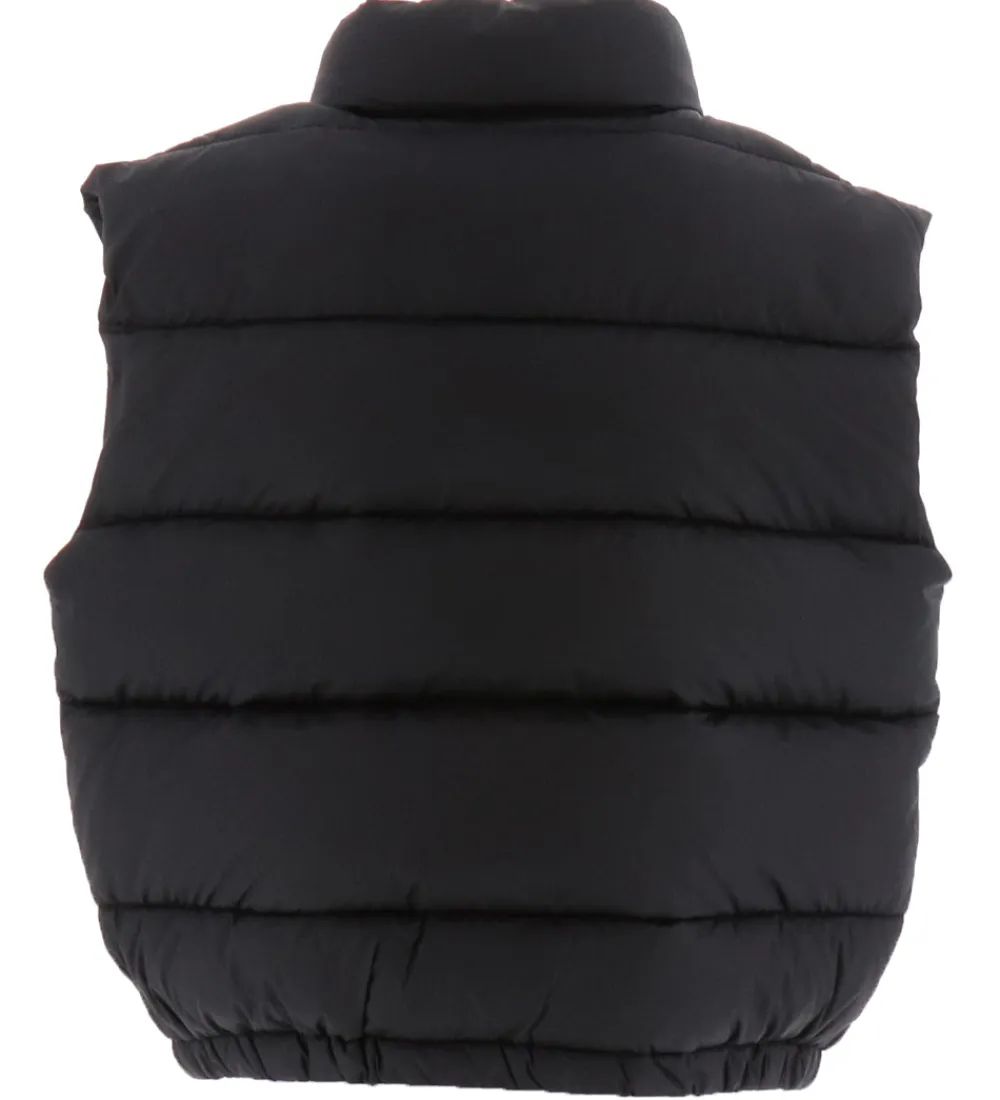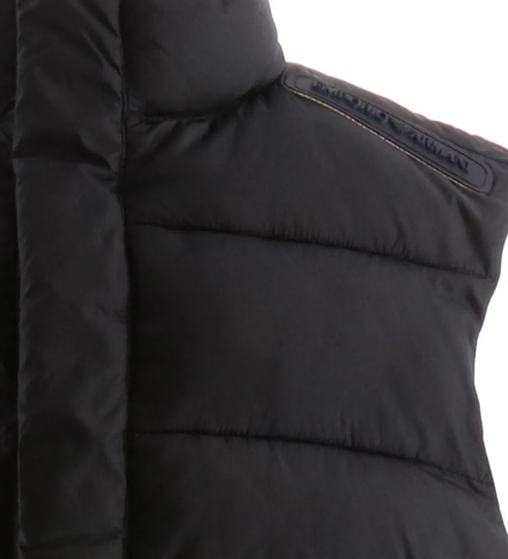Emporio Armani dynevesten har en høj hals, og i bunden har den en smal elastikkant. Dynevesten åbnes med skjulte trykknapper, og i siderne er der fleeceforede lommer. Dynevesten har et glatvævet for, og den er vatteret med ARDOR7, som er et letvægtigt, vandafvisende og åndbart materiale.