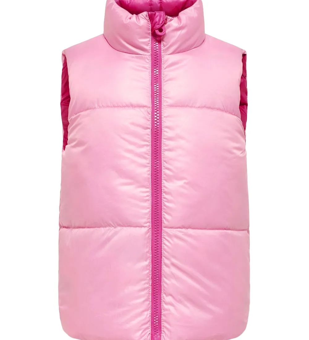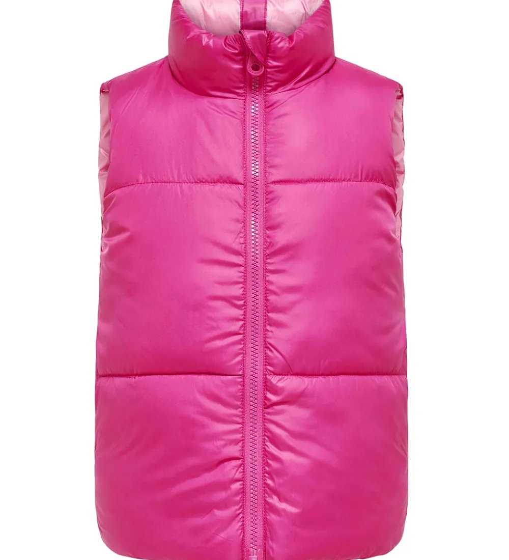 Lækker Kids Only dynevest med et vendbart design. På den ene side er den ensfarvet mørk pink, og på den anden side er den ensfarvet rosa.