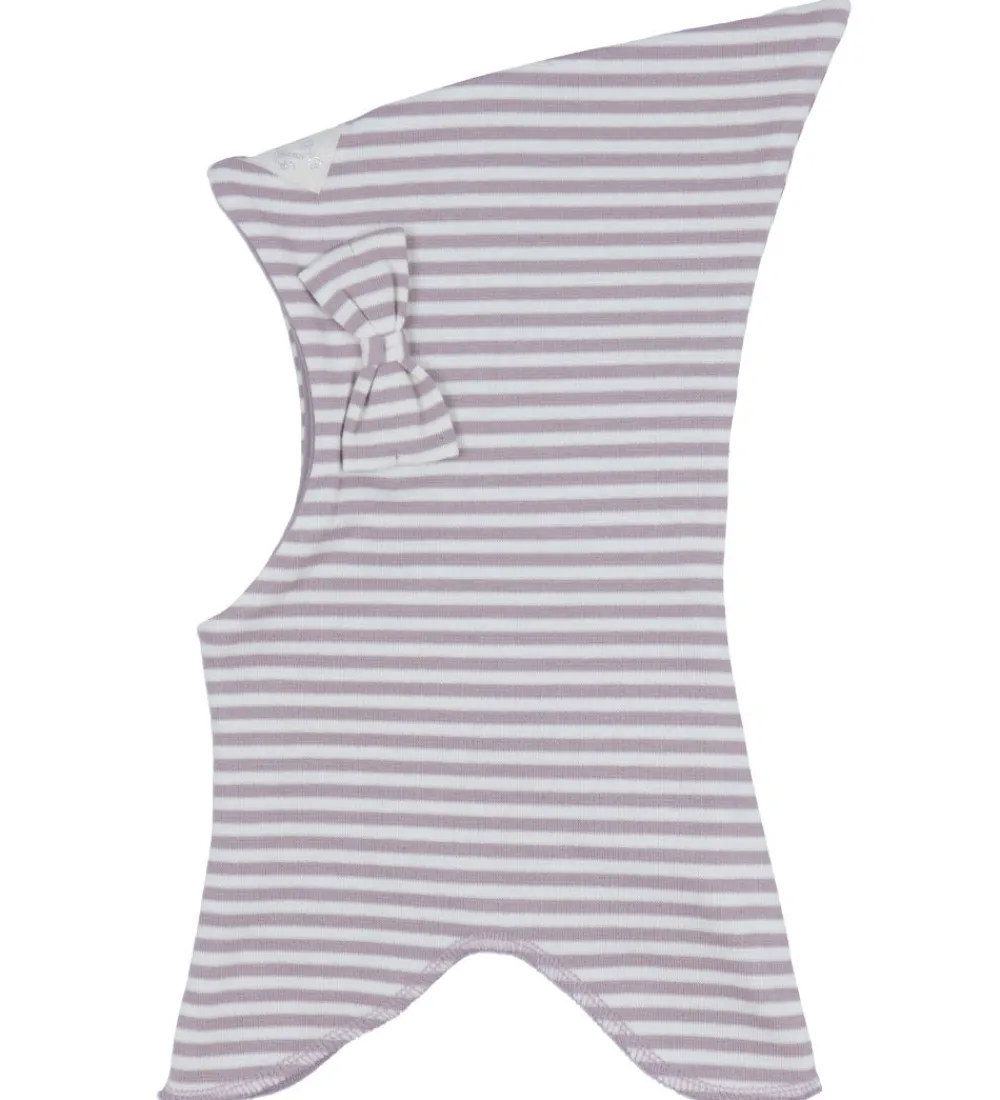 Sød Racing Kids elefanthue i et stribet design med søvet lilla og cremehvid og en dekorativ sløjfe på venstre side samt en logoapplikation på toppen.