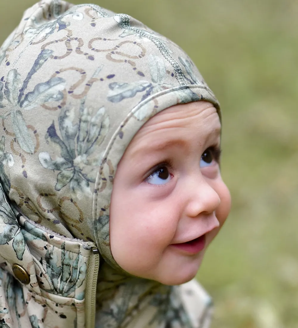 Flot Mikk-Line elefanthue i lysegrøn med et unikt træ- og slangeprint i grønne nuancer, der giver et unikt udtryk. Huen sikrer god varme og komfort til små hovedet.