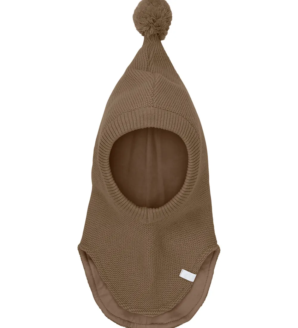 Elegant Minymo elefanthue i brun med strikket struktur. Minymo elefanthuen har en spids facon med ribkant omkring ansigtet og en kvast på toppen. Nederst er der et smart split-design. Elefanthuen består af to lag med bomuld inderst og en blanding af uld og polyakryl yderst.