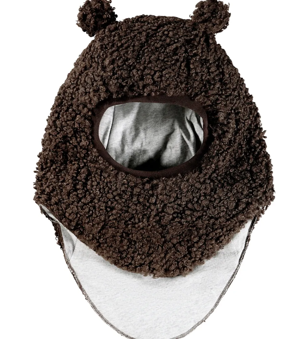 Charmerende Molo elefanthue i mørkebrunt teddyfleece. Molo elefanthuen består af to lag og har en rund hovedform med små ører på toppen. Den indvendige del har en blød, grå overflade, der giver et stilrent udtryk.