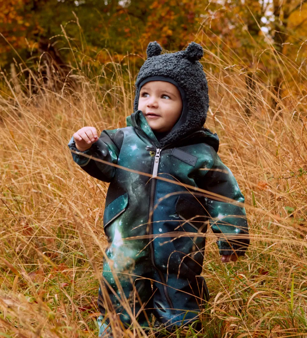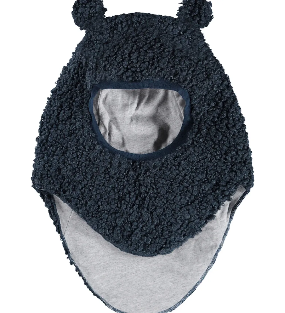 Flot Molo elefanthue i mørkeblå teddyfleece og med et gråmeleret for. Molo elefanthuen består af to lag og har en rund hovedform med små øre-detaljer på toppen.