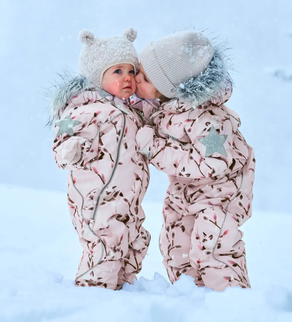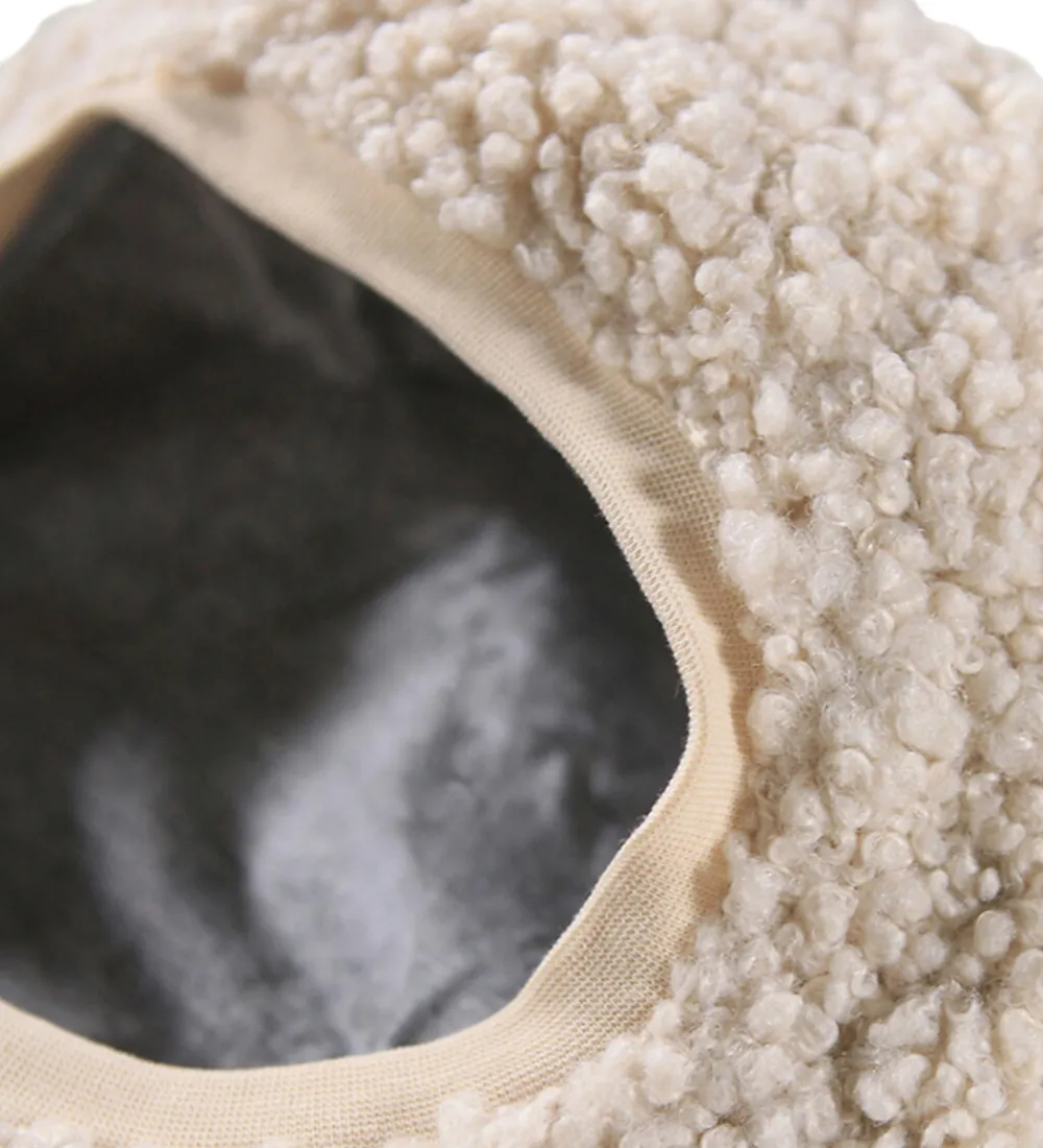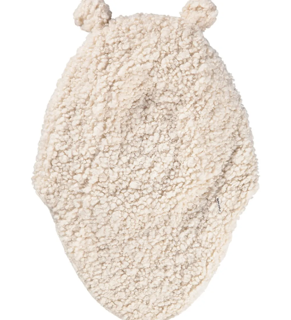 Blød Molo elefanthue i flot, cremefarvet teddyfleece. Molo elefanthuen består af to lag og har en rund hovedform med små, dekorative ører. Indersiden er i grå, jerseylignende materiale for ekstra beskyttelse.