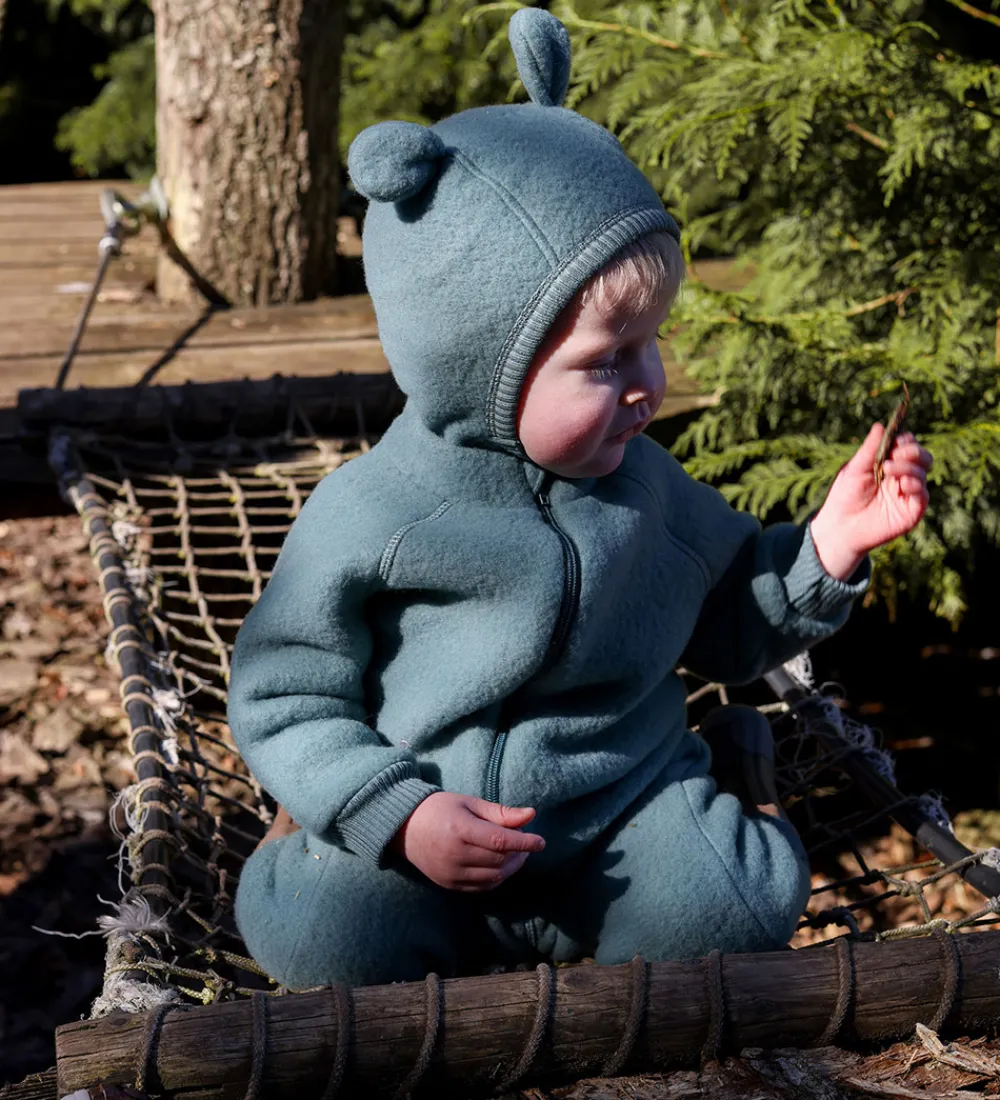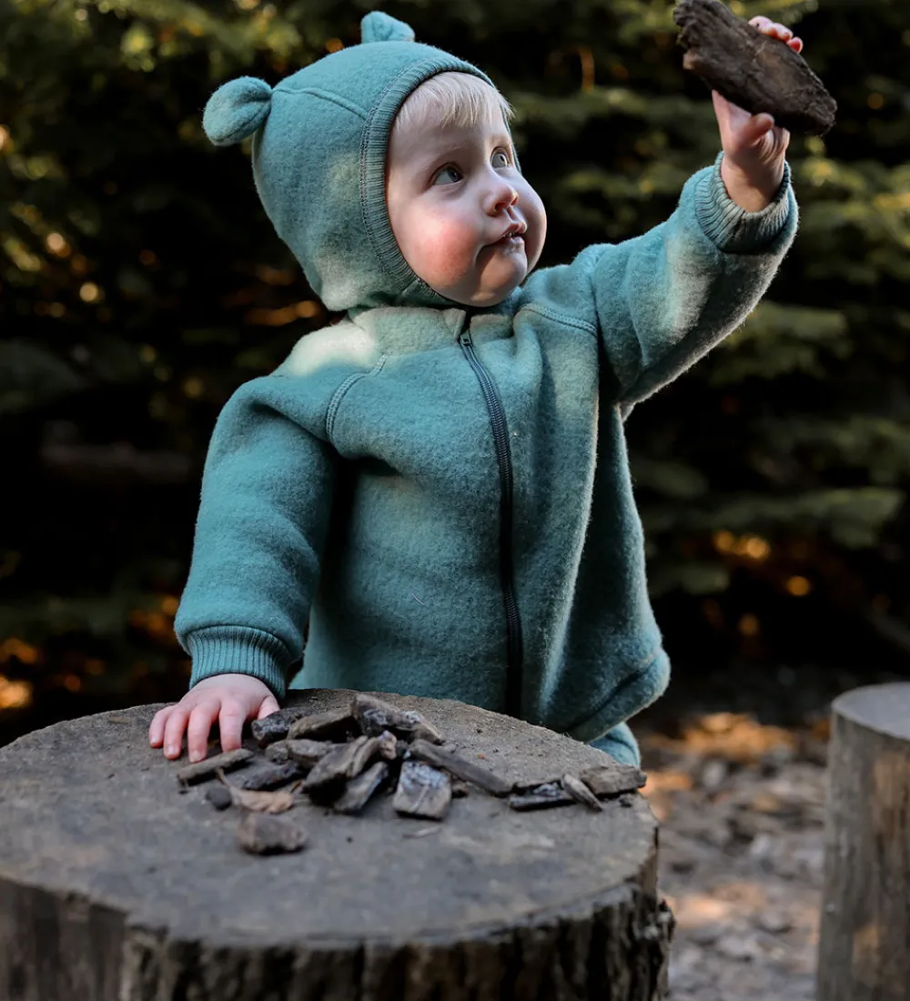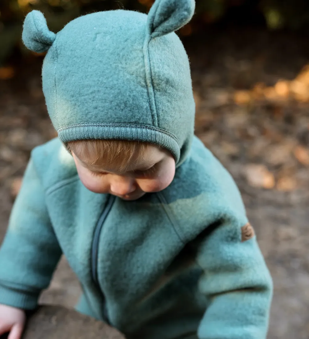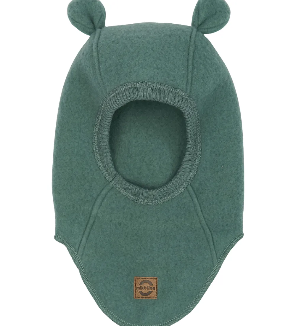 Skøn Mikk-Line elefanthue i støvet grønt, filtet merinould og med søde ører på toppen.