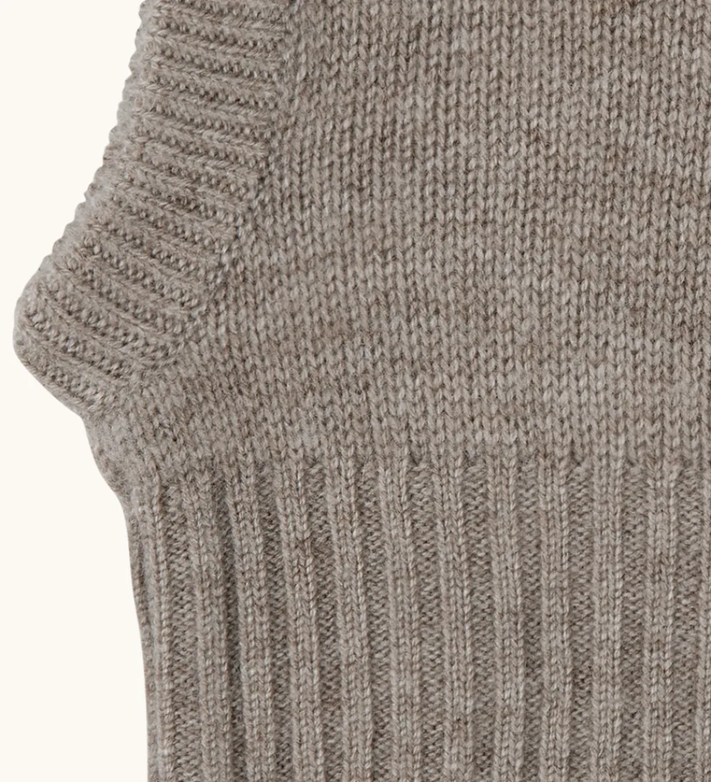 Fin Lalaby elefanthue i ensfarvet brun. Lalaby elefanthuen har en rund hovedform og en bred ribkant i bunden. Denne eleafanthue er håndstrikket i Nepal, og den er lavet af eksklusivt kashmir.
