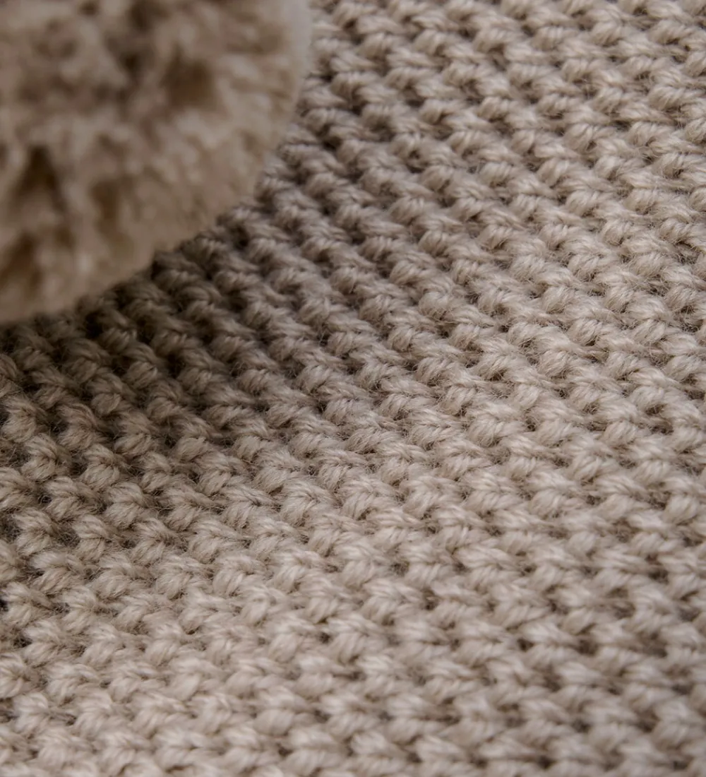 Fin Huttelihut elefanthue strikket i en meleret mørkebeige med et flot mønster. På toppen har elefanthuen to kvaster.